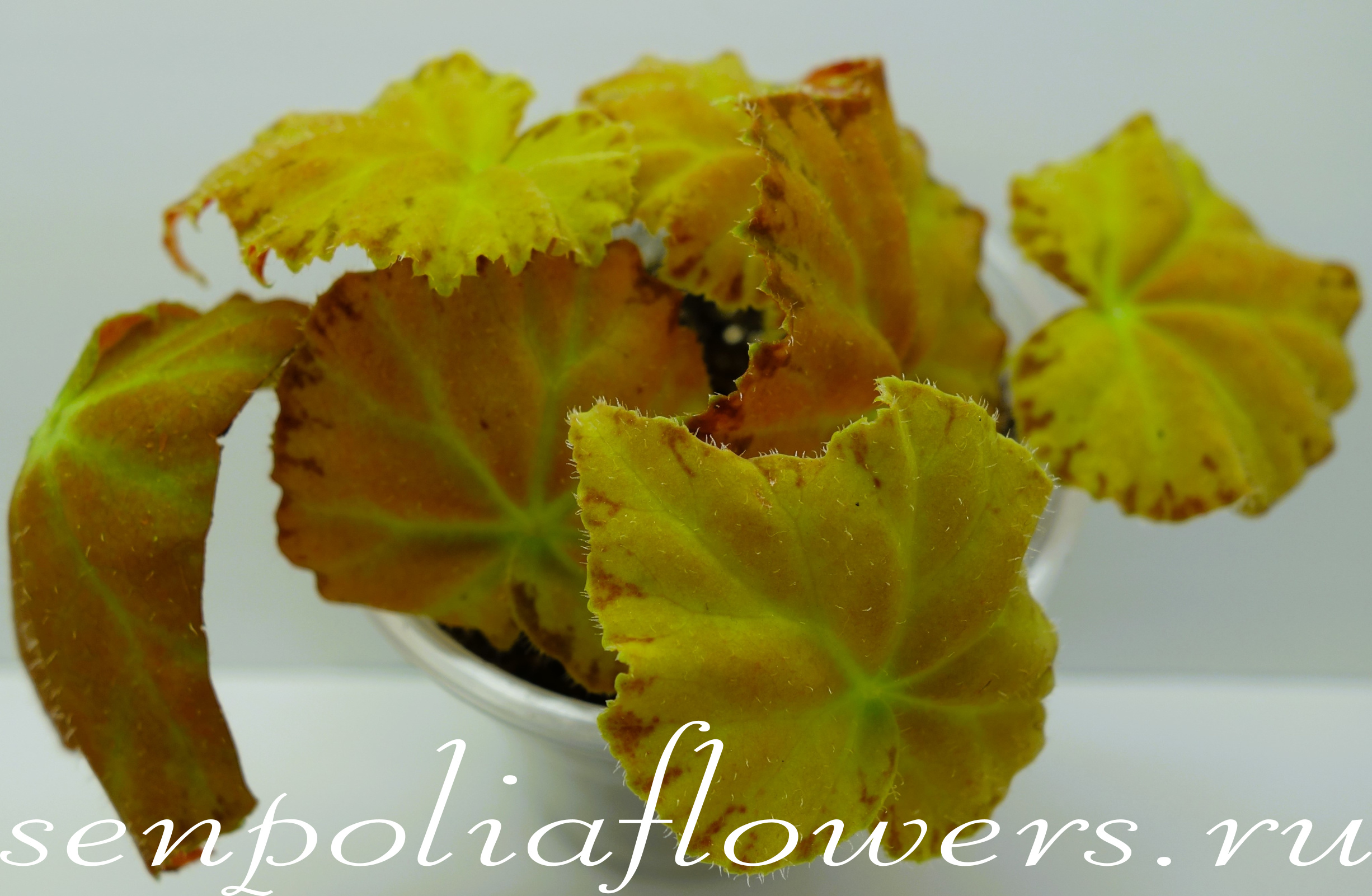 Бегония Amber Love - компактная ризомная бегония с небольшими листьями зелёно-золотистого и янтарного оттенка в зависимости от освещения. Форма листа асимметрично-сердцевидная с заостренным кончиком и зубчатым краем.