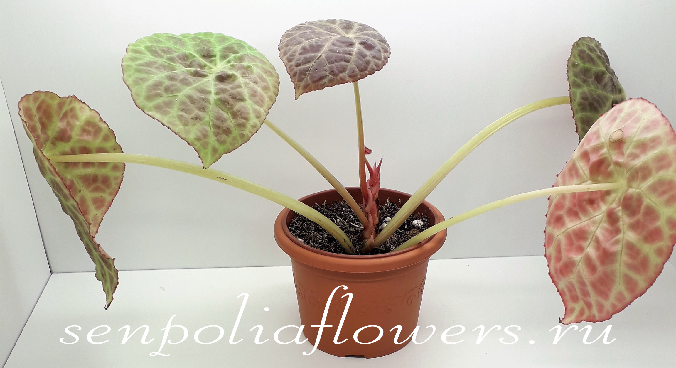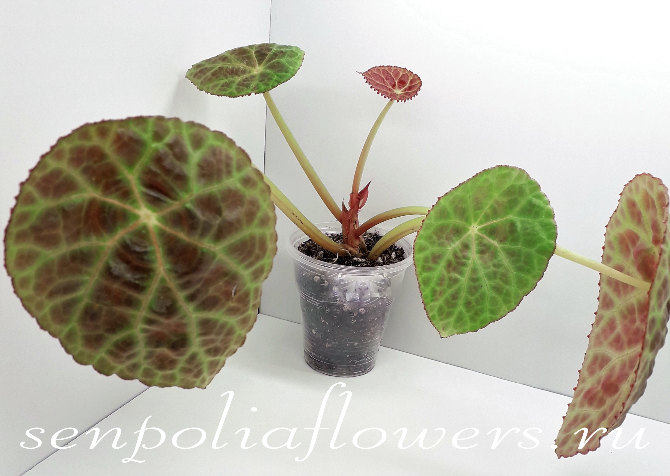 Ризомная бегония с округлым глянцевым листом со слегка заострённым кончиком, коричнево-зелёного цвета, жилки светло-зелёные, изнанка ярко-розовая. Из центра листовая пластина стянута в форме паутины. Очень необычная по форме бегония.