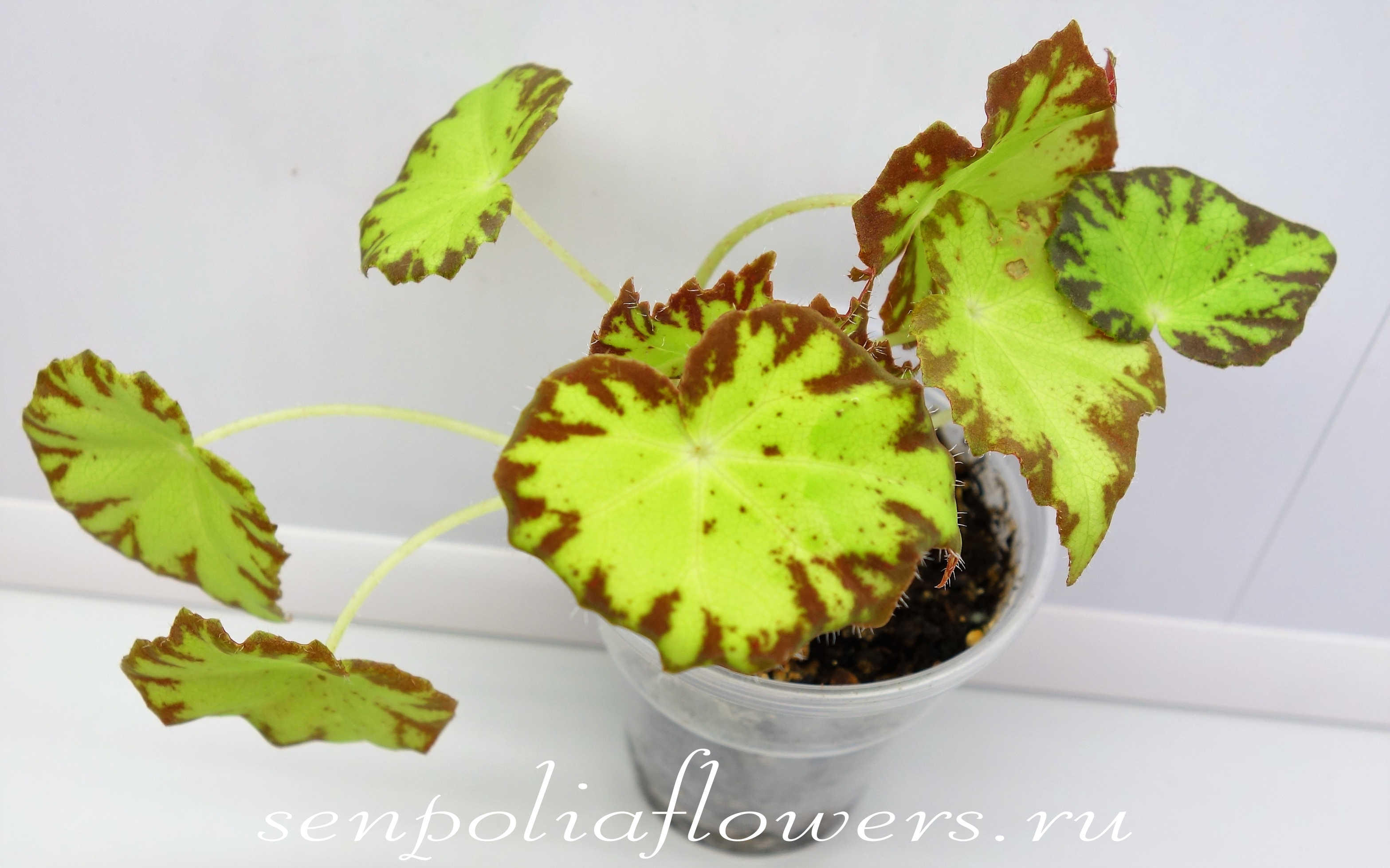 Компактная ризомная бегония. Любит рассеянный свет, достаточную влажность воздуха и хороший полив. Листья лимонно-зеленые с зубчатыми, волнистыми краями и фиолетово-бордовой каймой. Неприхотливая, растет быстро.