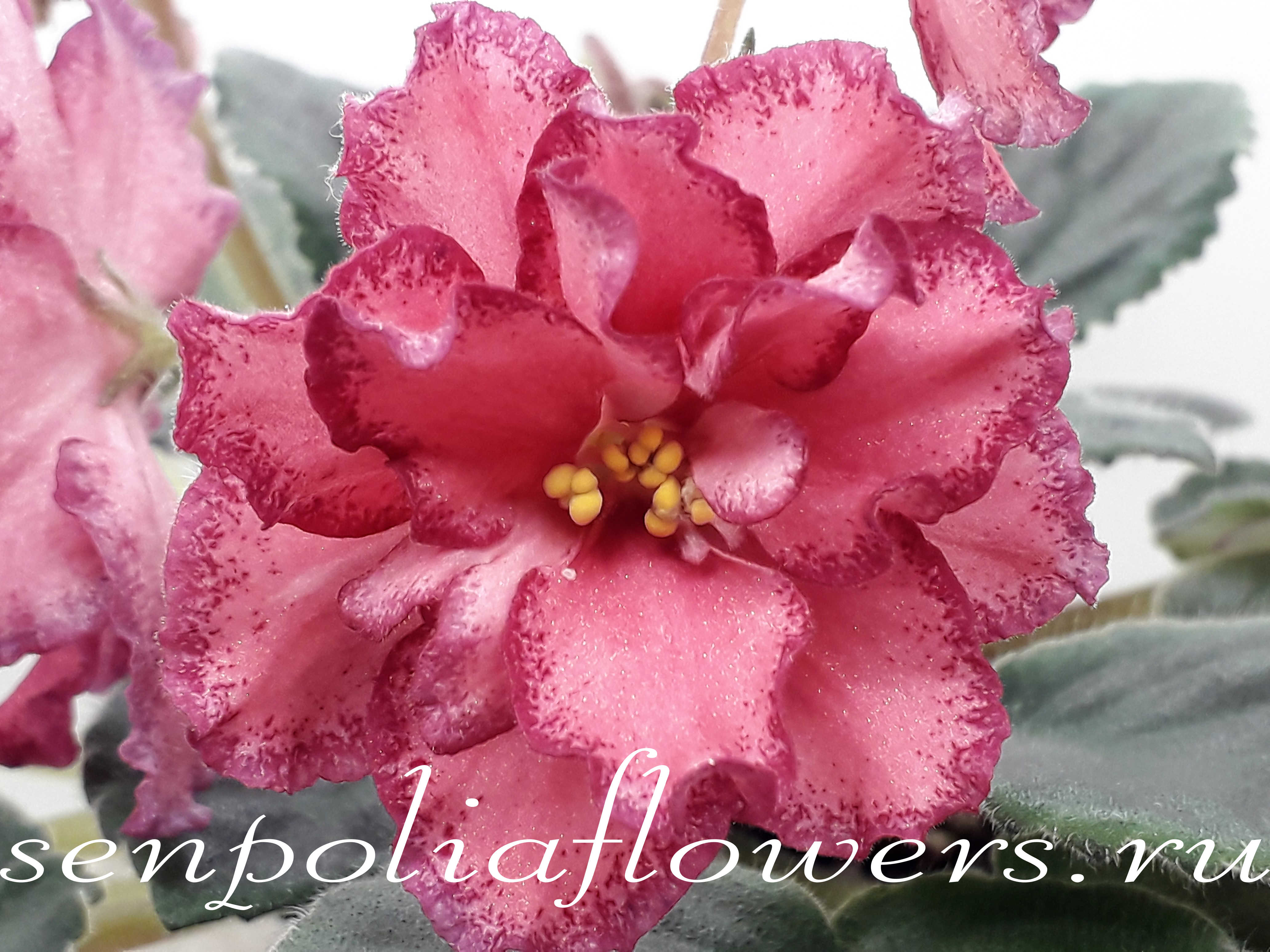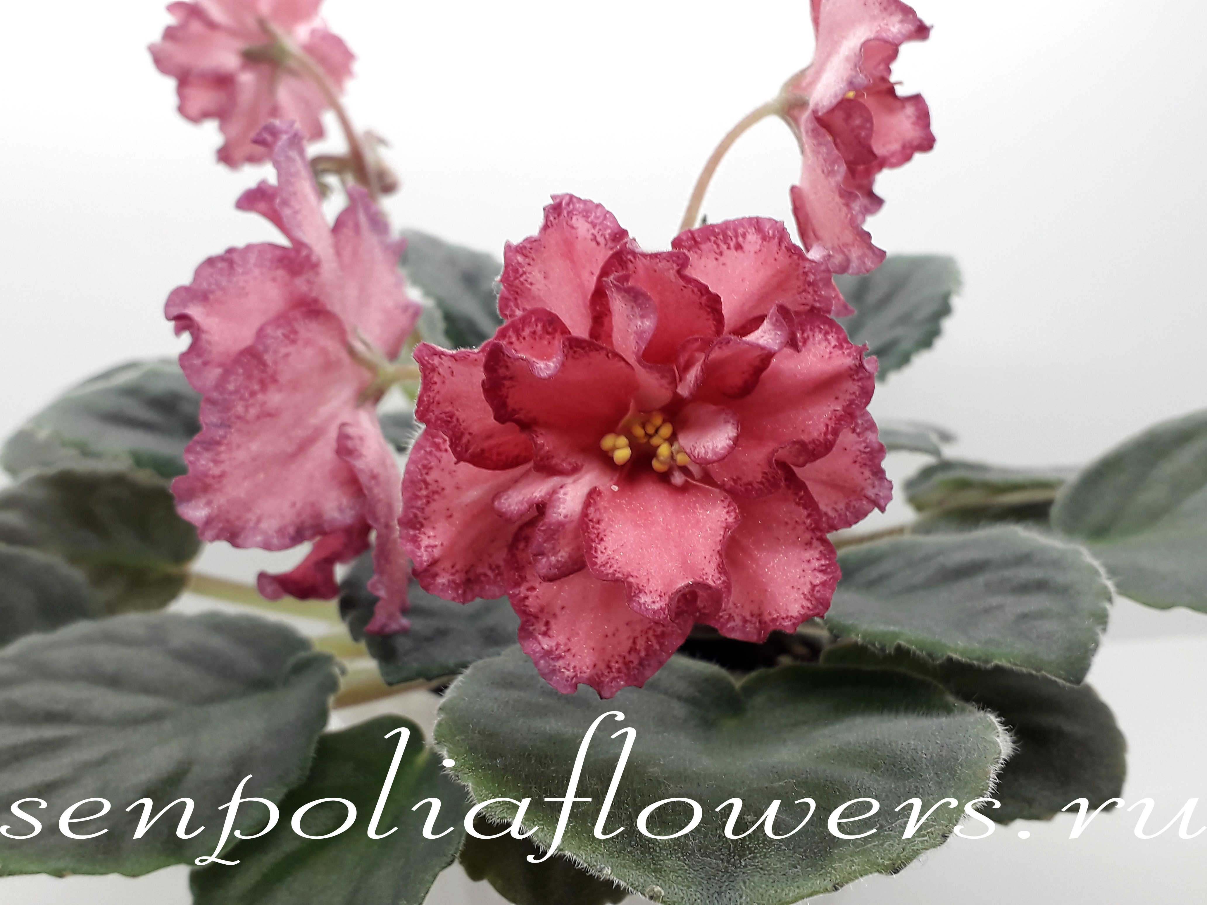 Крупные полумахровые белые волнистые звезды с пастельно-розовым глазком и малиновым фэнтези по краям лепестков. Допускается вариант цветения пастельно-розовым без белого с малиновым фэнтези по краям. Розетка компактная из стеганных зубчатых листьев. Стандарт.