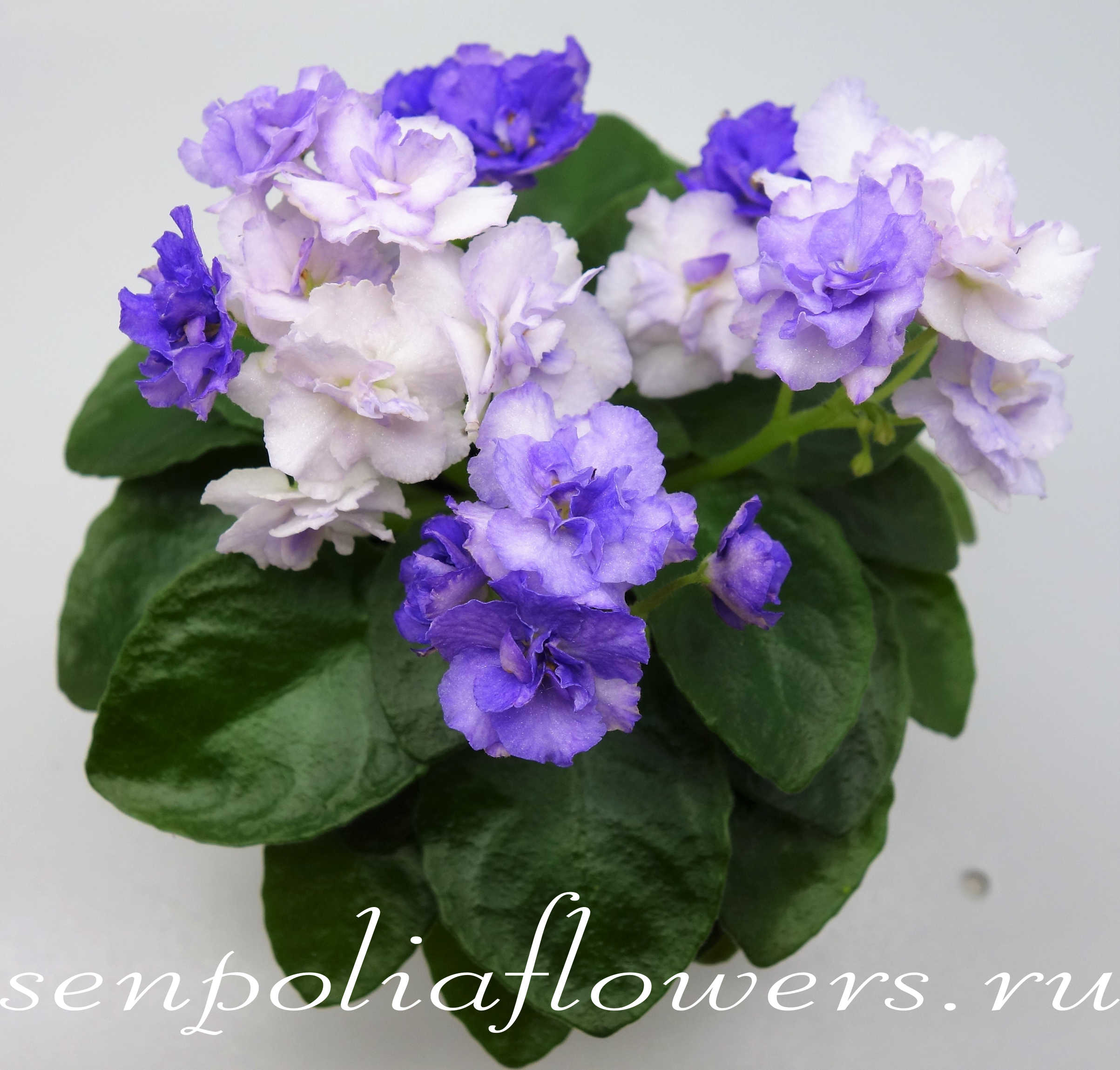 Махровые пепельно-синие звезды с тонкой белой окантовкой. Блестящая оливково-зеленая листва с красной изнанкой. Миниатюра - ( описание сорта). У спорта очень много белого и светло-синего на лепестках.