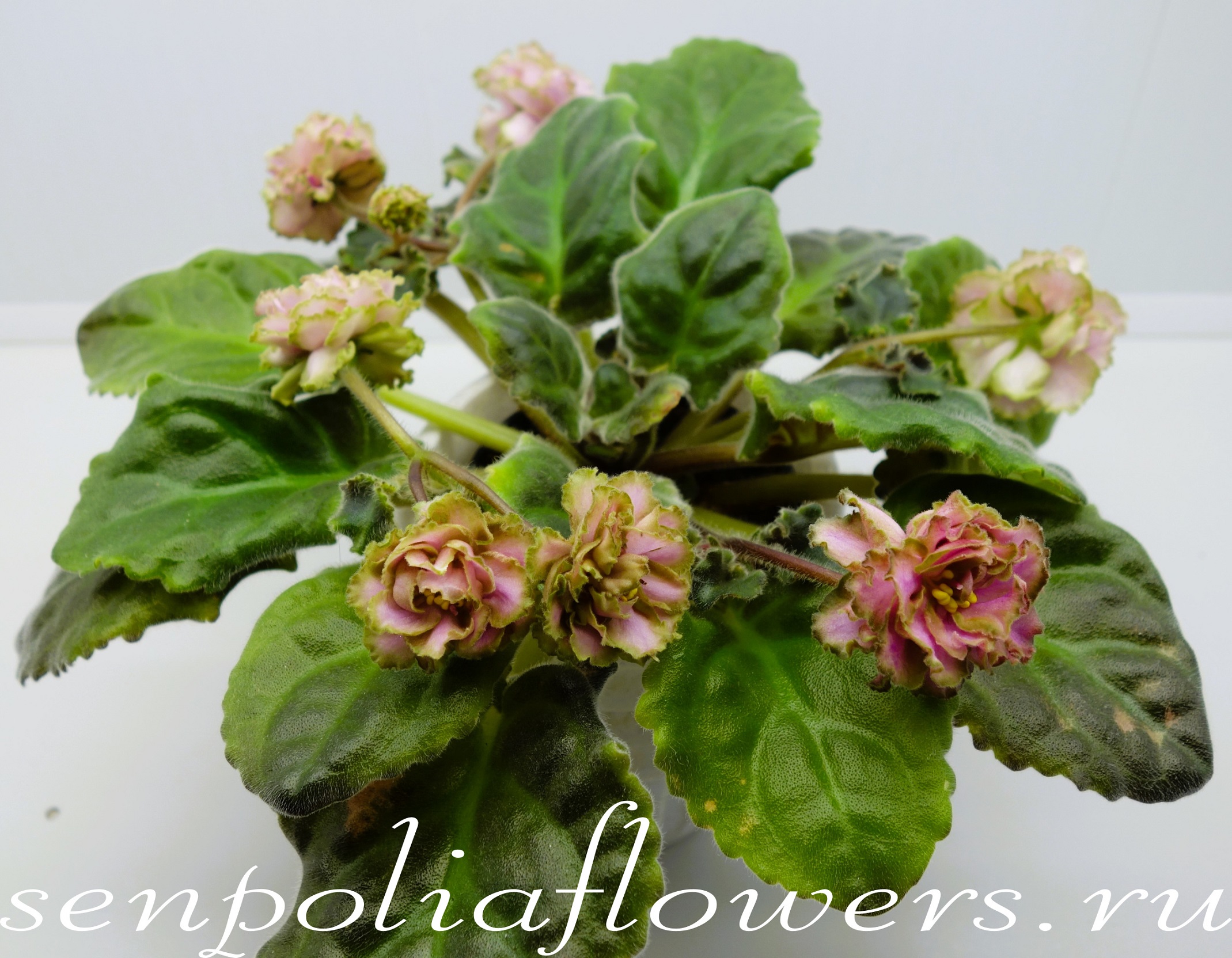 Крупные густо-махровые розово-лиловые розочки с зелеными рюшками по краю лепестков. Хорошая розетка из слегка волнистых, насыщенно-зелёных зубчатых бархатистых листьев. Цветение восхитительными гроздьями лилово-зелёных розочек!