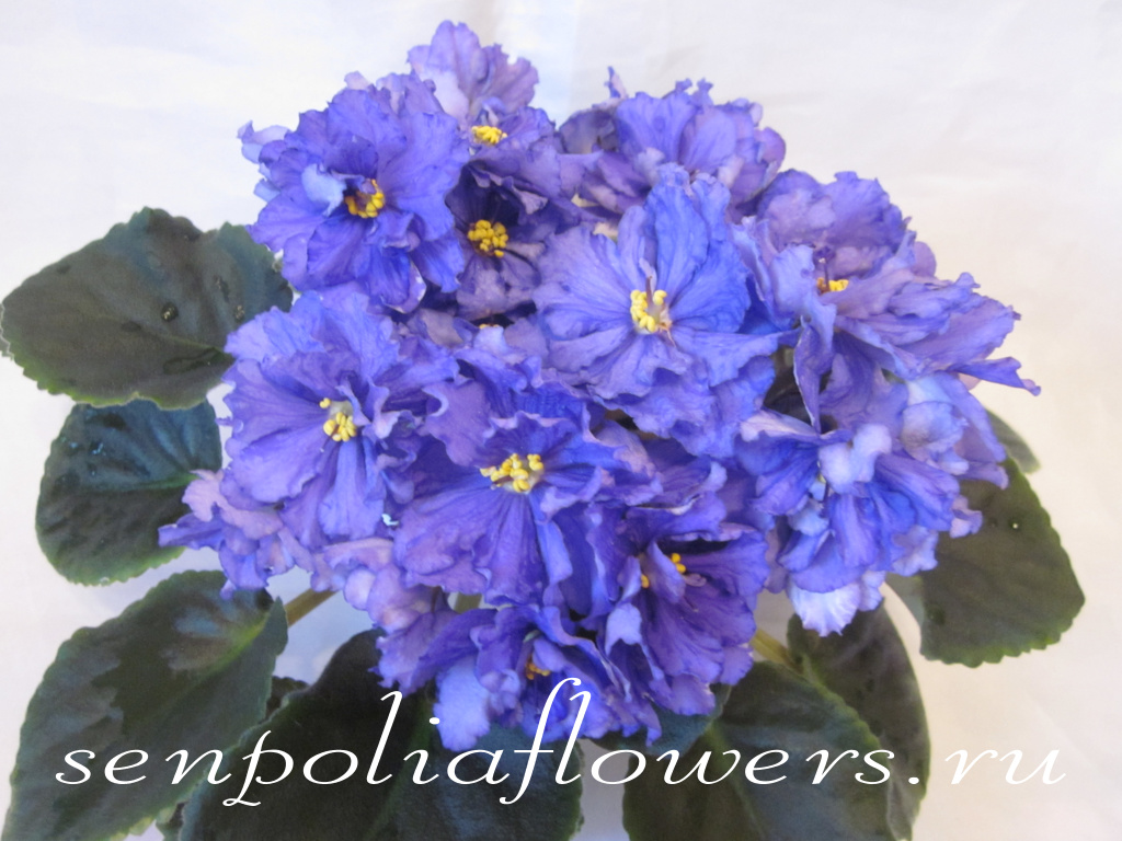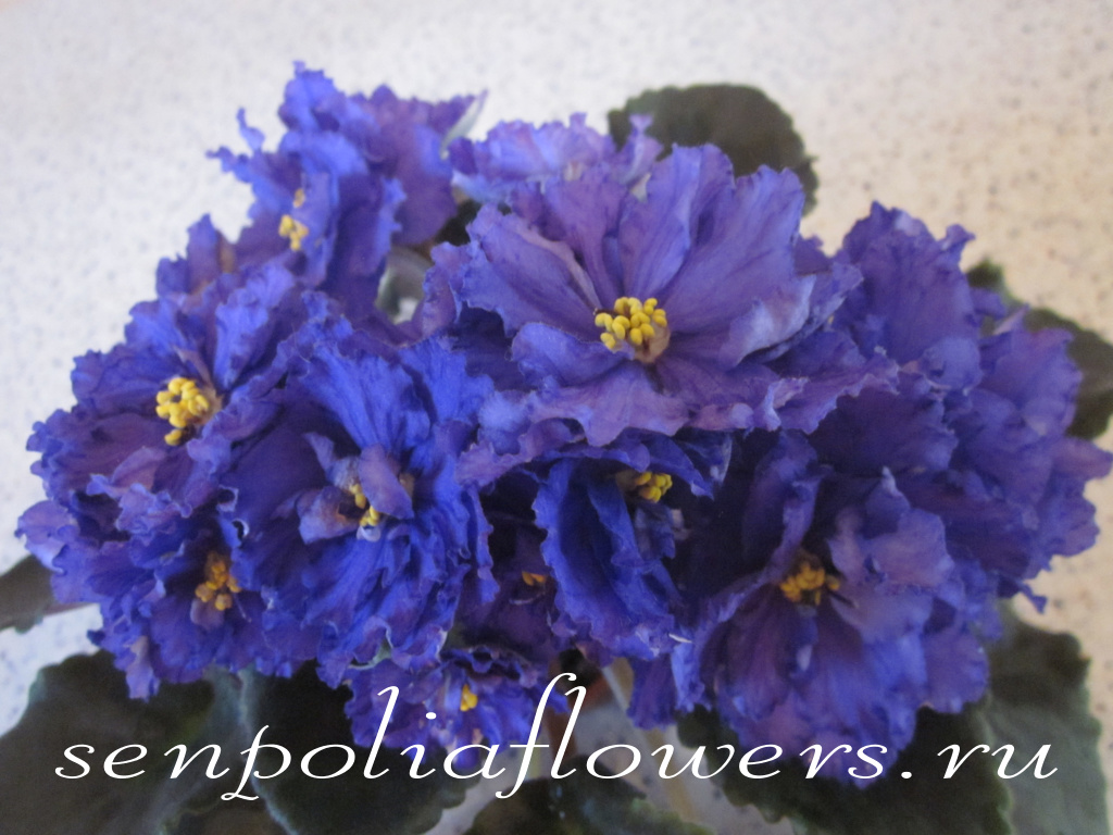 Огромные махровые пышные васильково-синие цветы с тёмно-сапфировыми ручейками фэнтези и с белыми кончиками лепестков. Идеальная выставочная розетка из тёмно-зелёных листьев. Богато цветущий, нарядный сорт! (Описание автора)