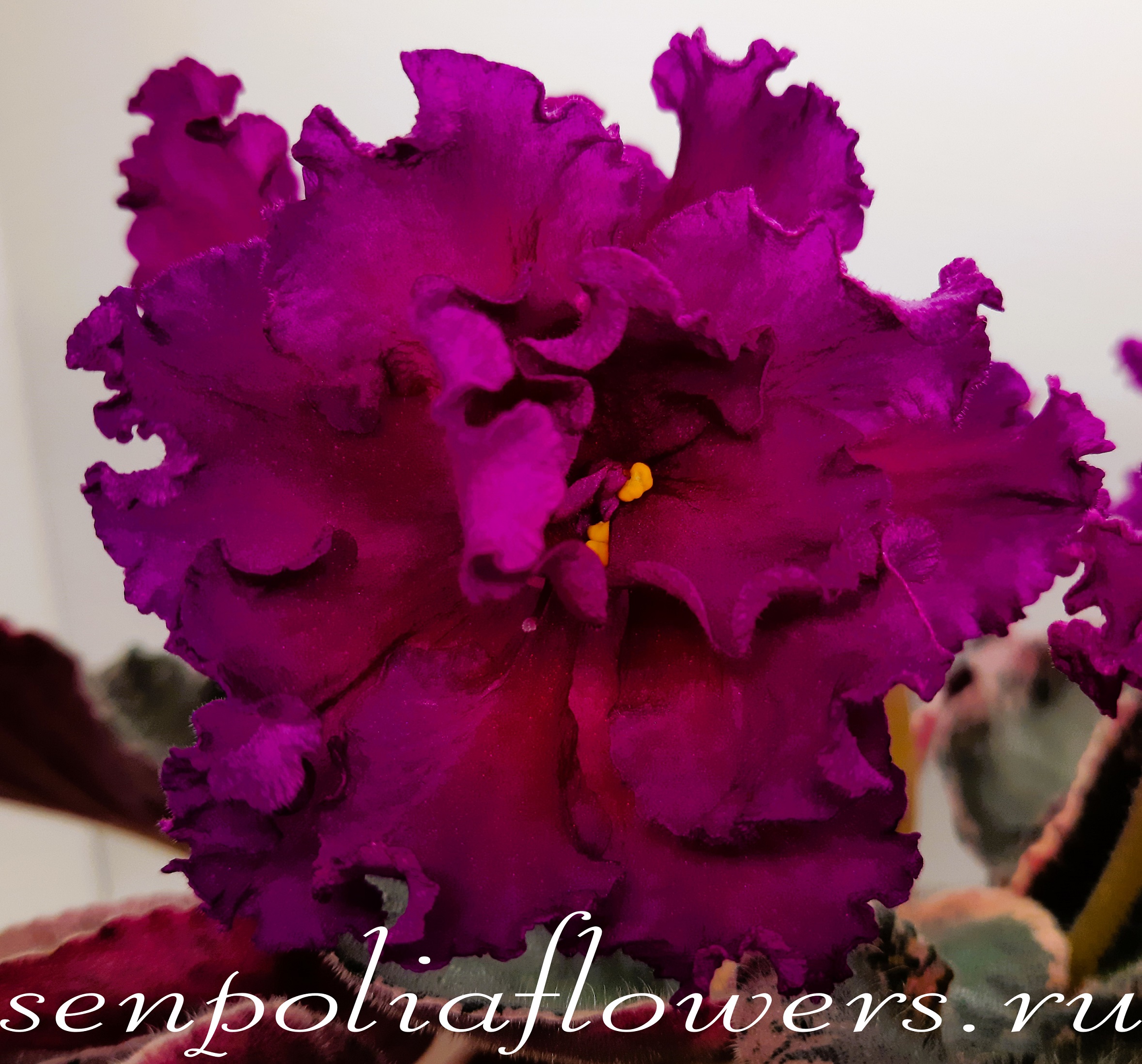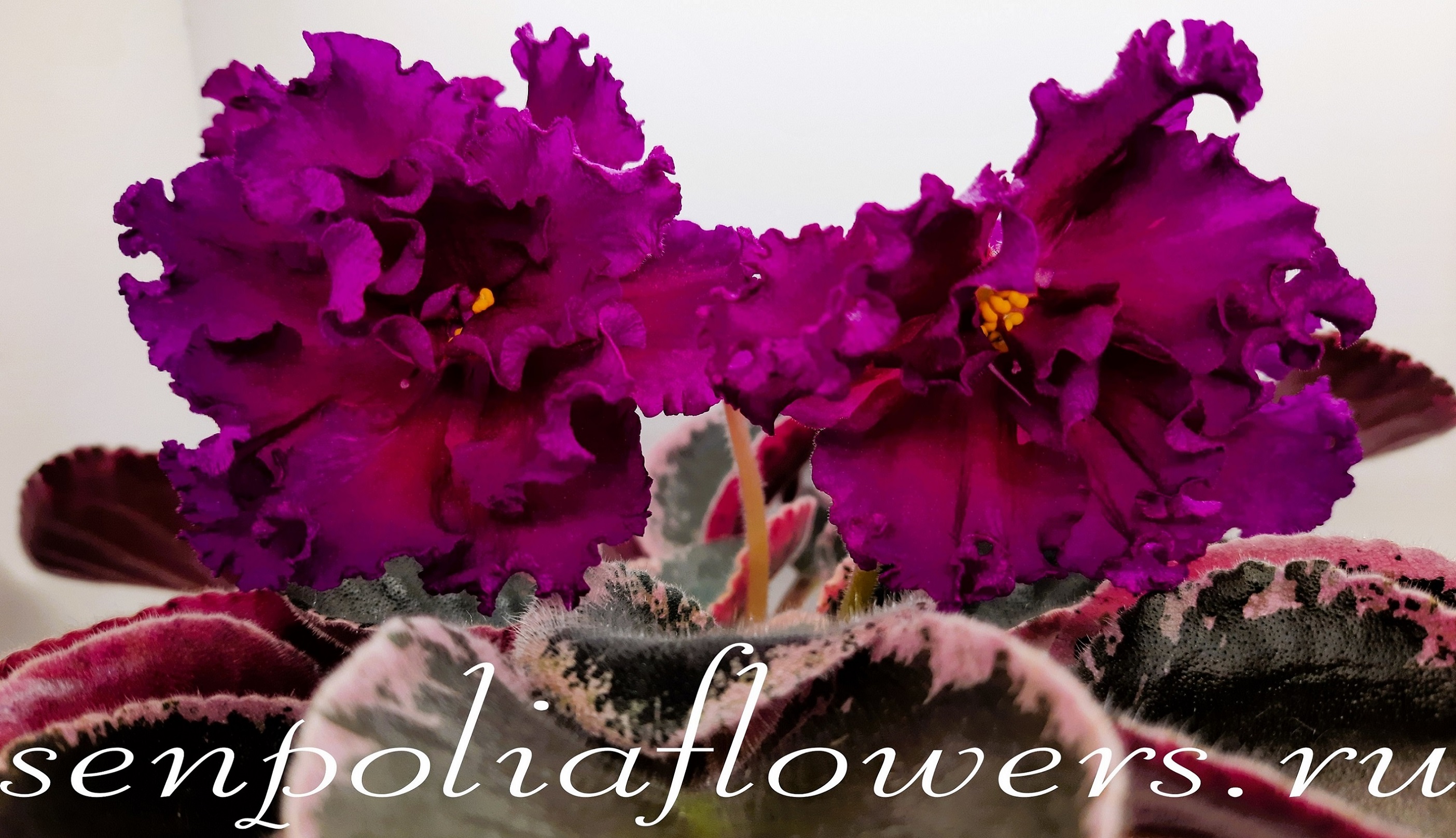 Огромные (7см) густо-махровые бахромчатые белые цветы с розовыми тенями и пурпурными отметинами. Выставочный пестролистник из зелёных листьев с белыми краями. ( описание сорта) Спорт цветёт однотонным пурпурным цветом.
