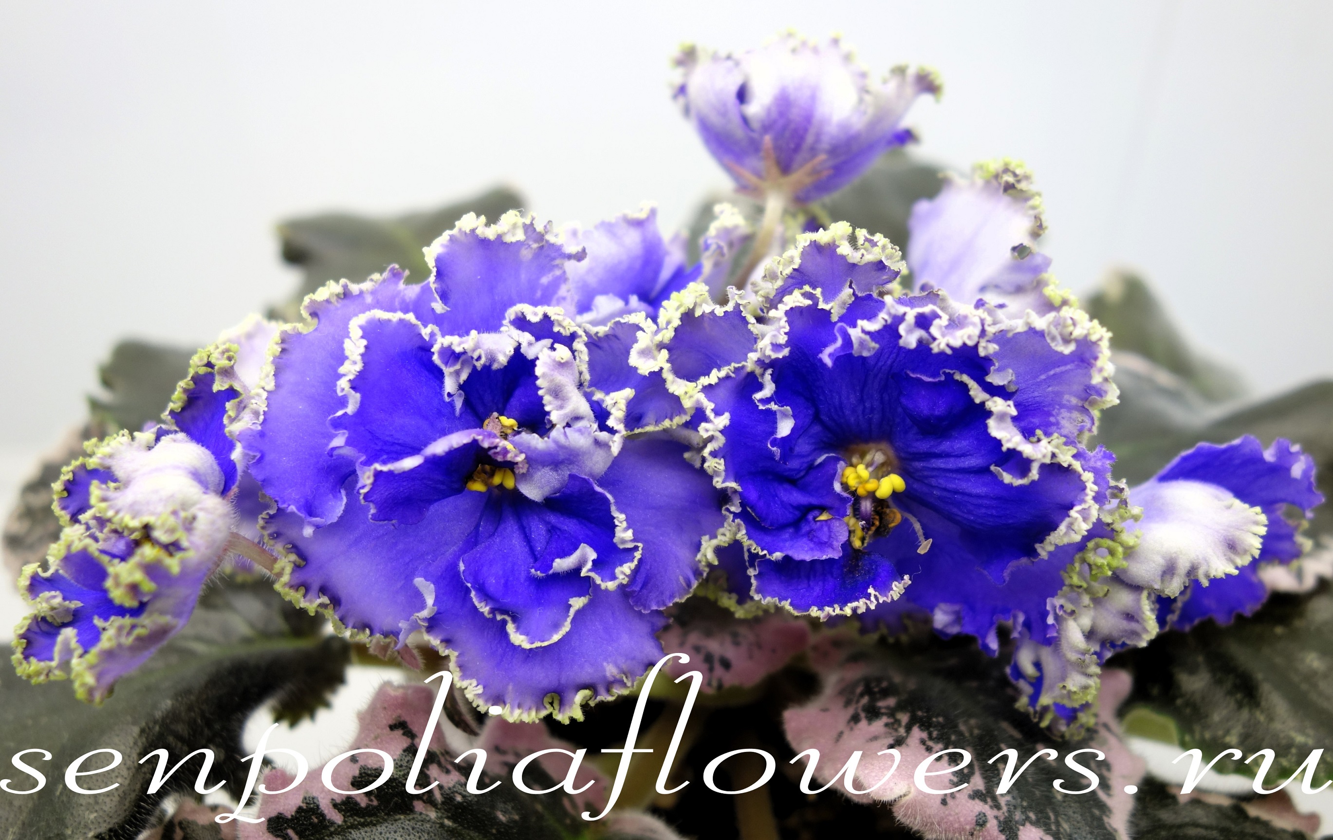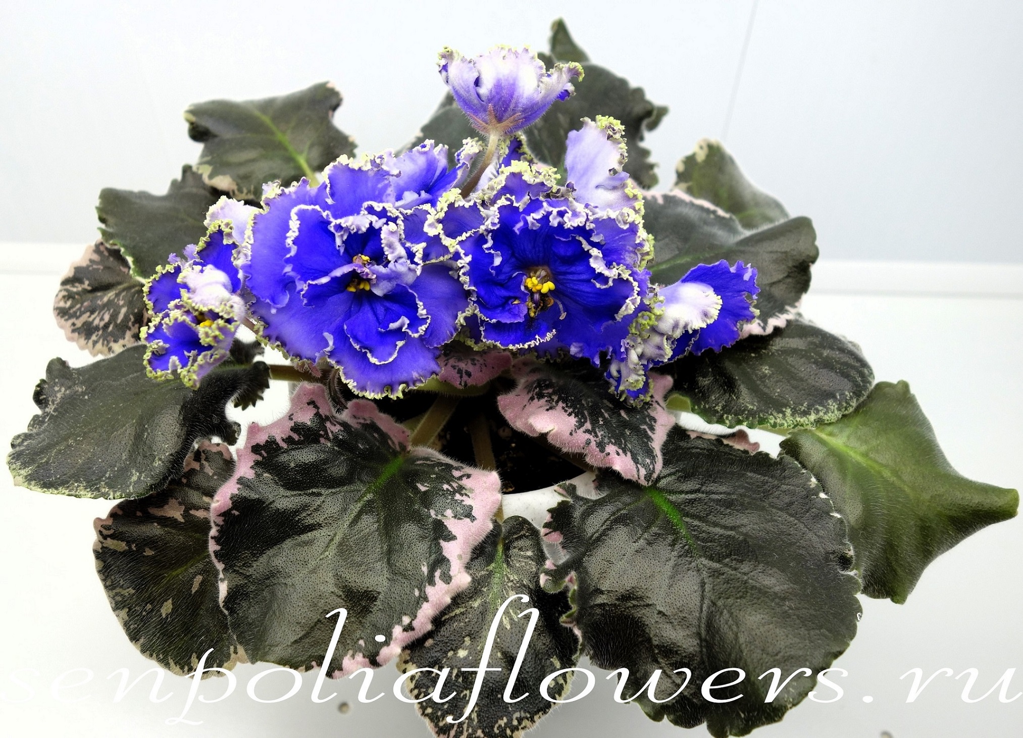 Нарядная выставочная пестролистная розетка из насыщенно-зелёных зубчатых листьев с лиловой каймой и такими же пятнышками по всему листу. Обильное цветение.