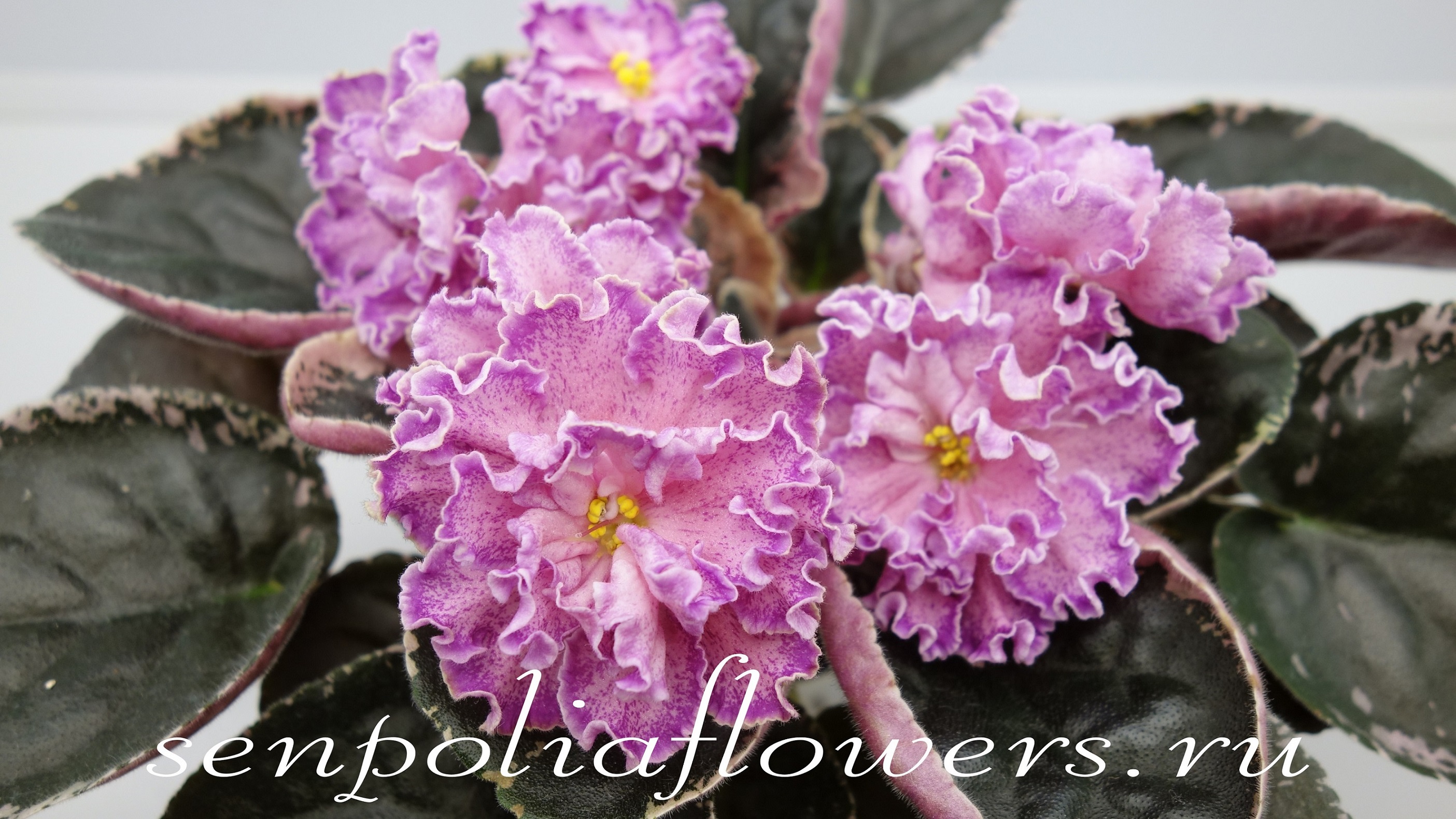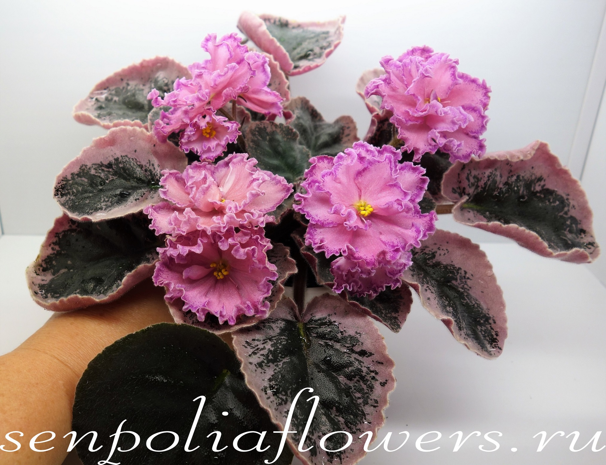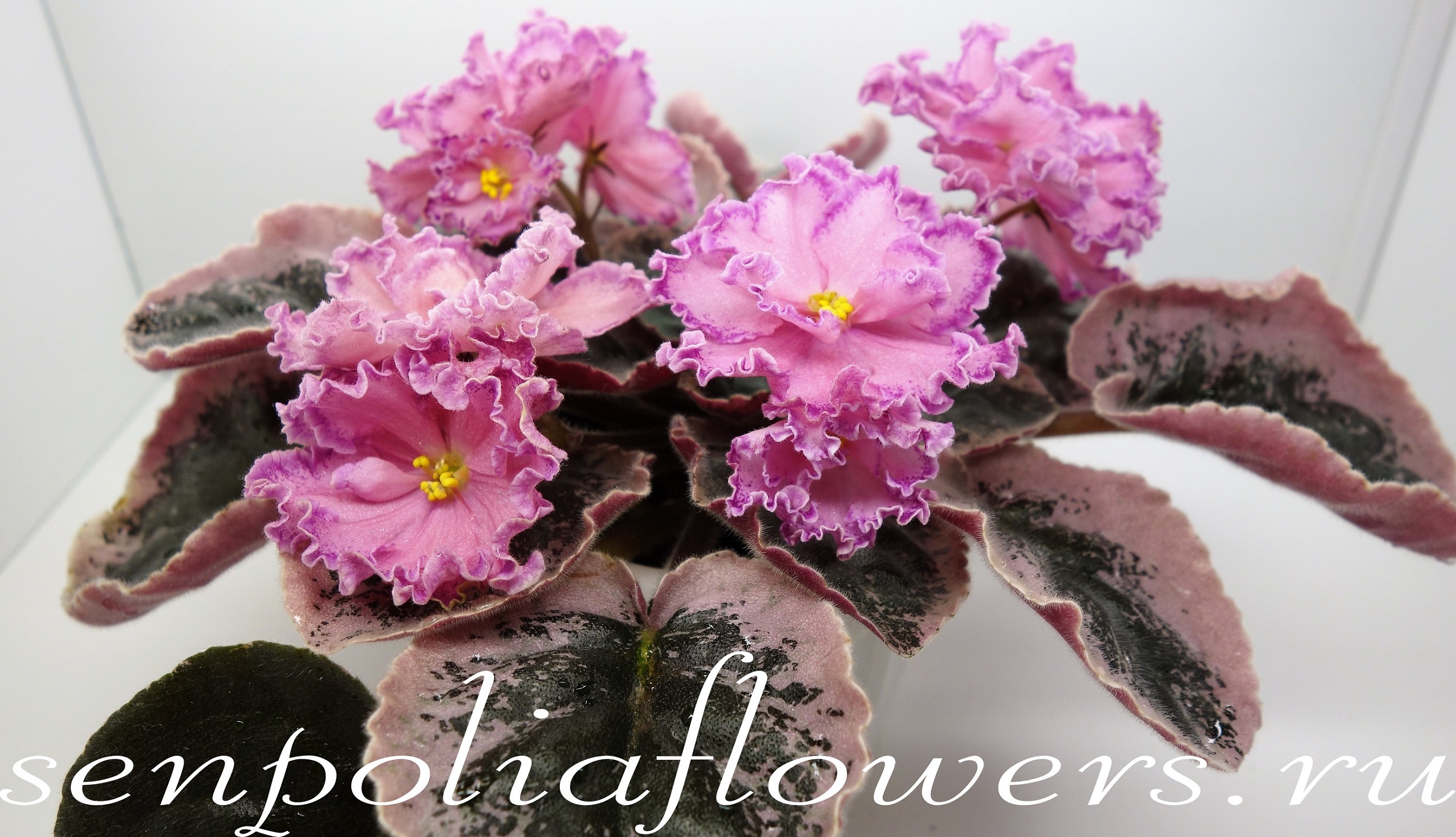 Крупные полумахровые тепло-розового цвета звезды с гофрированными краями лепестков, украшенных по краям крапчатой фуксиевой каймой. Темно-зеленые с серебристо-розовой пестротой листья. Ровная выставочная розетка. Стандарт