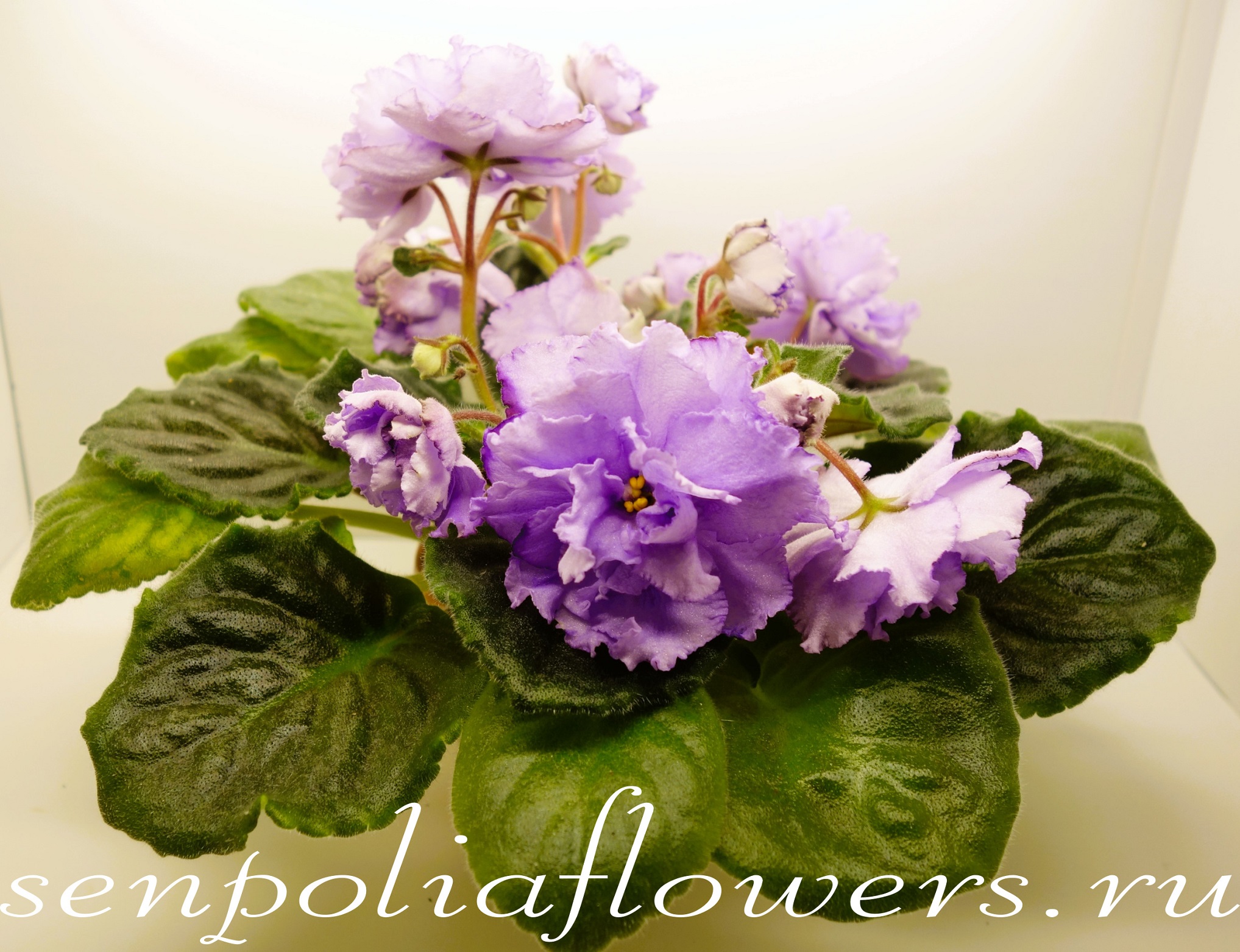 Крупные махровые цветы белого цвета с тонкой сине-фиолетовой каймой, которая по мере роста цветка немного расплывается по краям лепестков. Светлая компактная розетка со слегка волнистыми листьями. (Описание автора)