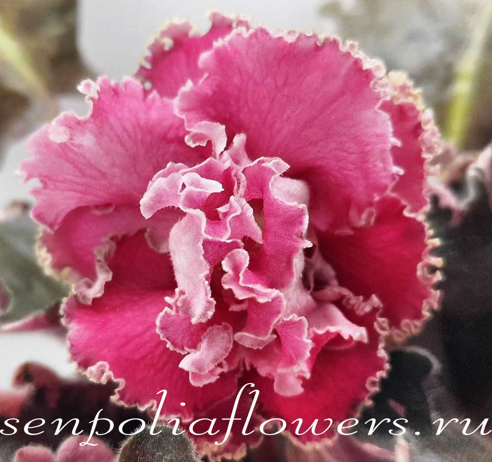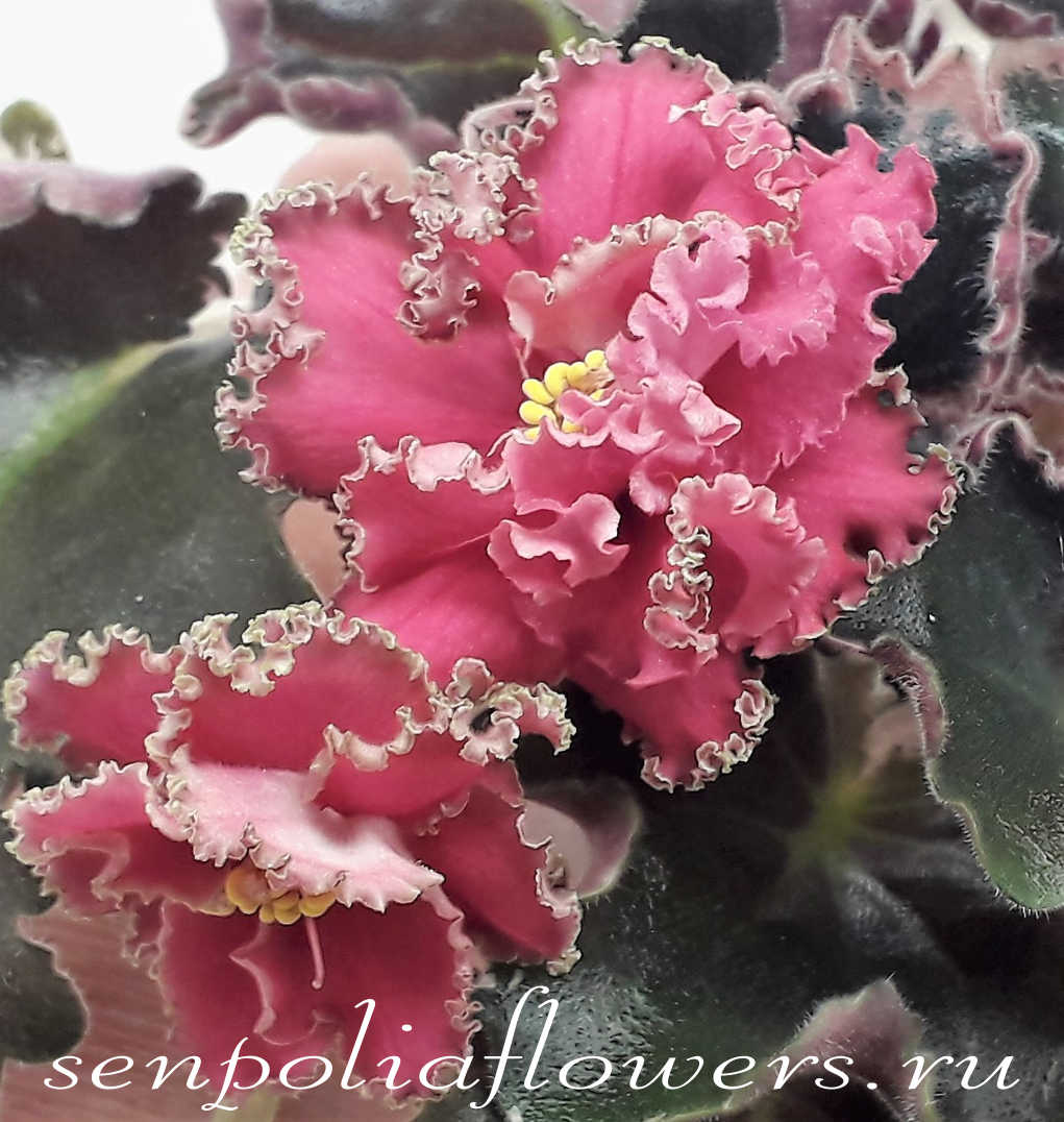 Ярко-коралловые махровые цветы с бахромчатым краем. В прохладных условиях появляется бронзово-зелёная кайма. Пестролистные зубчатые стёганные темно-зелёные с розовым листья с пурпурной изнанкой. Стандарт.