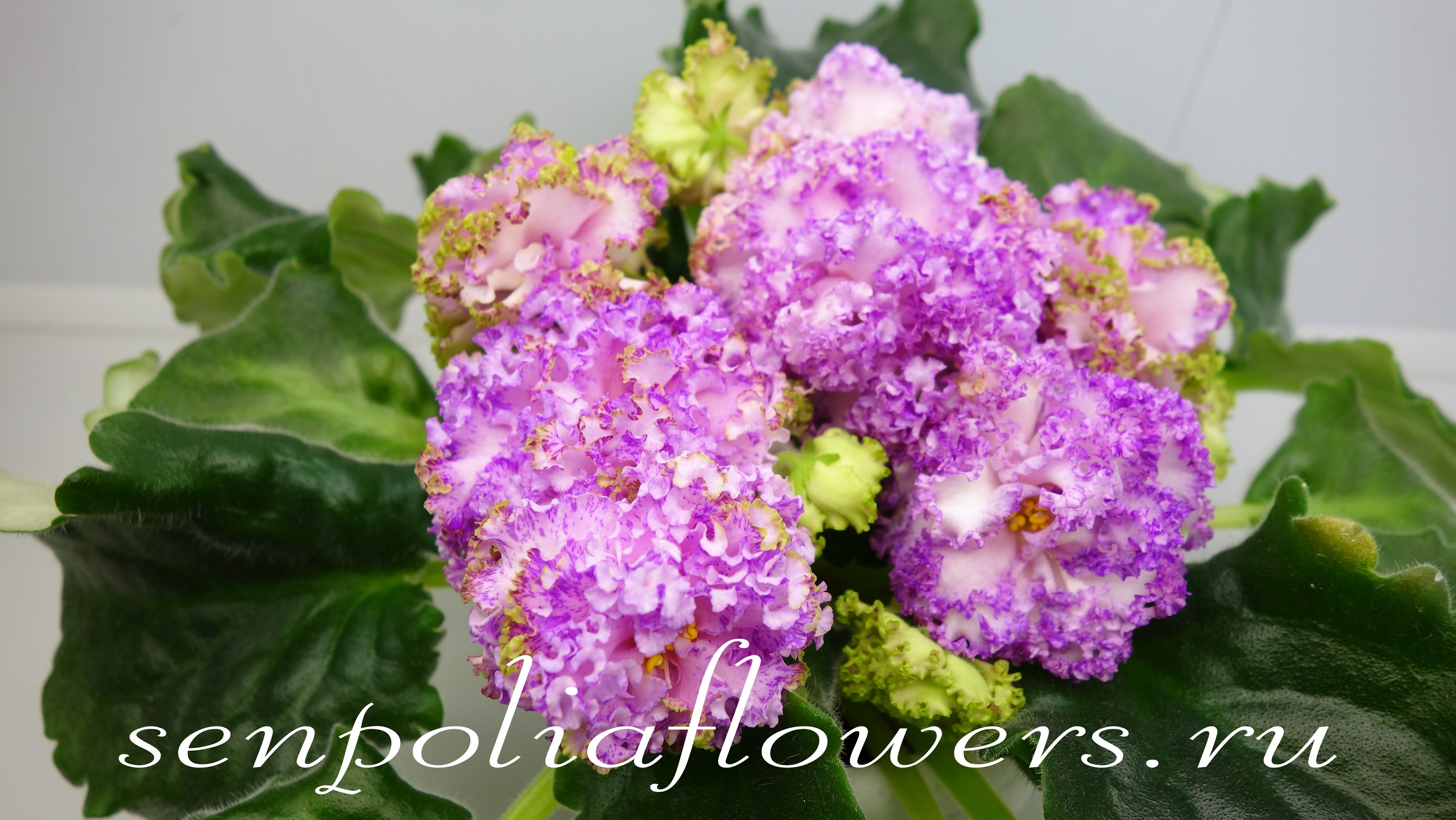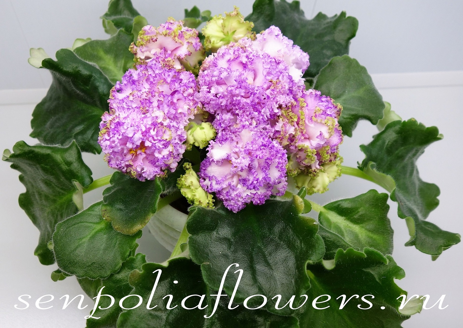 Цветы крупные до 7 см. Густомахровые, в роспуске долго находятся в виде "кочанчиков". Лепестки белые с легкой розовизной, по краю малиновая с напылением кайма и зеленая густая рюша. Лист средне-зеленый, волнистый.