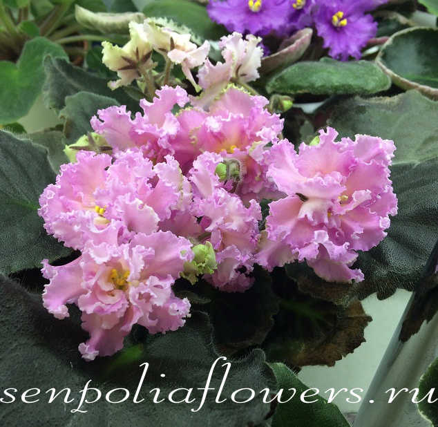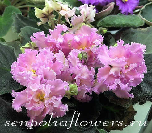 Довольно крупные махровые бахромчатые бело-розовые цветы с жёлтым центром и зеленой бахромкой. Листья волнистые темные, возможны фрагменты более светлого зеленого цвета. Пышное, продолжительное цветение.
