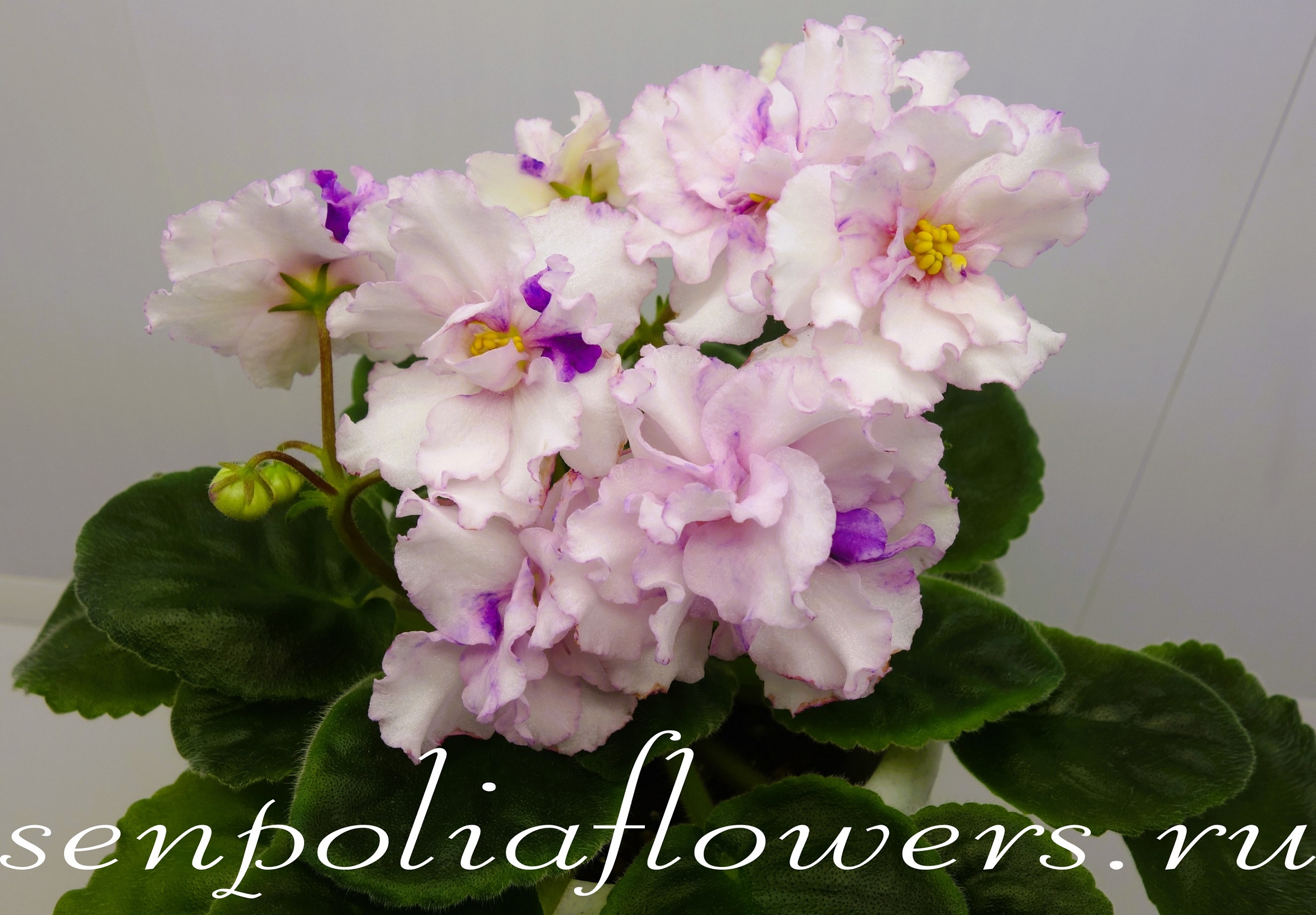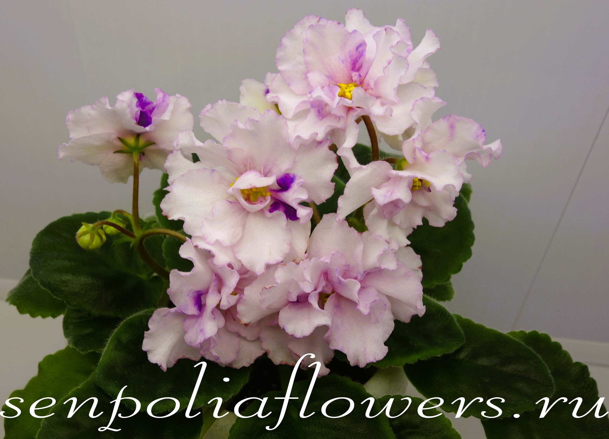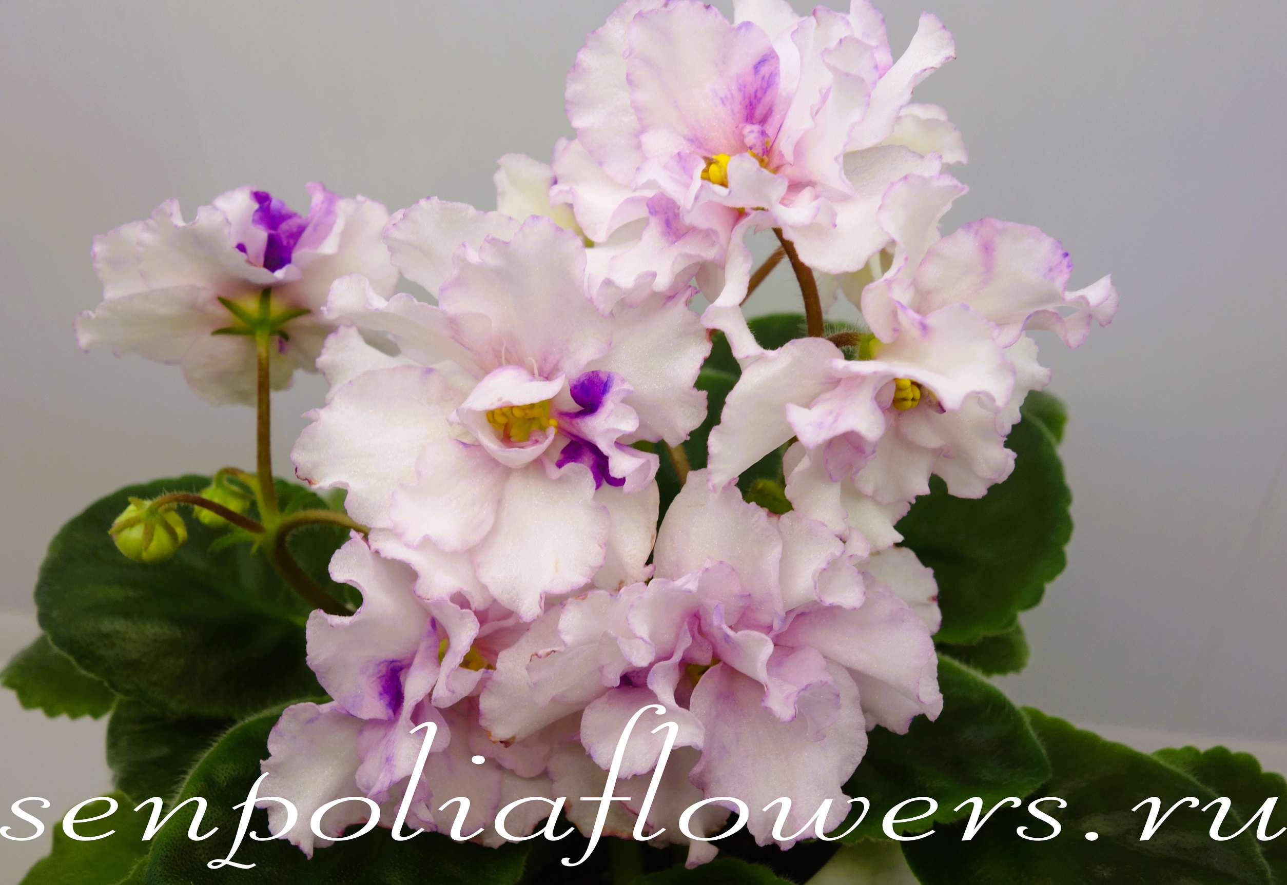 Крупные махровые бахромчатые белые цветы-помпоны с тонкой нежно-розовой каемочкой, розоватым глазком и нежно-голубым редким фэнтази по центру цветка. Очень нежные «зефирные» цветы. Обильное цветение. Зеленая стандартная розетка