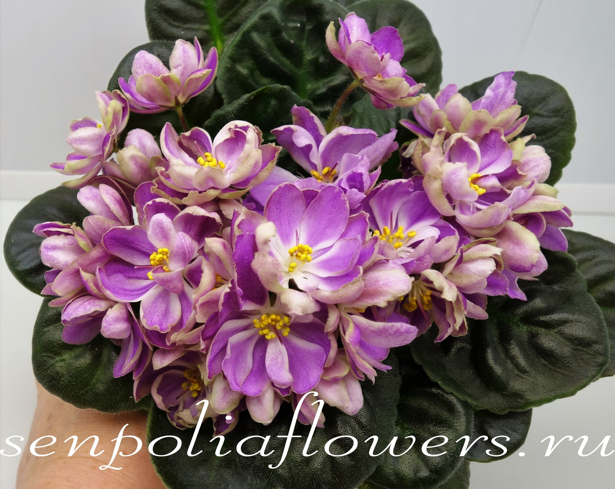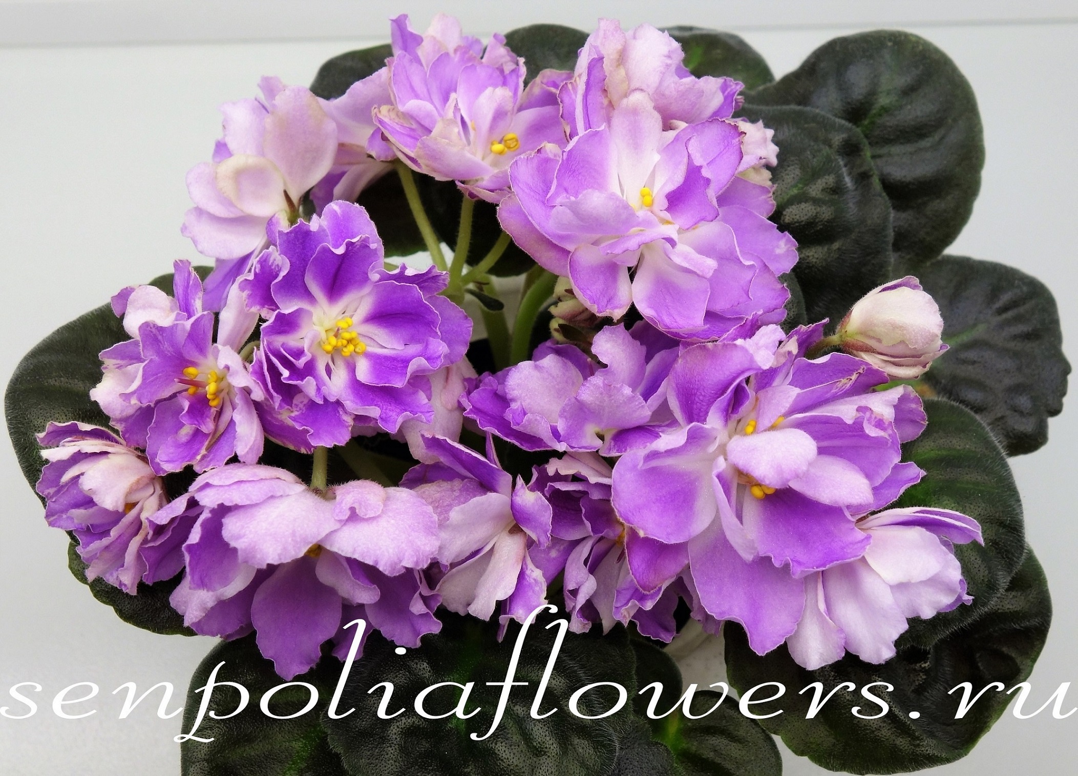 Крупные полумахровые и махровые цветы розово-лилового тона с белой непостоянной каймой иногда переходящей в белый глазок, с узкими удлинёнными лепестками в центре цветка, по форме напоминающими цветы хризантемы. Простая зелёная листва. Стандарт.
