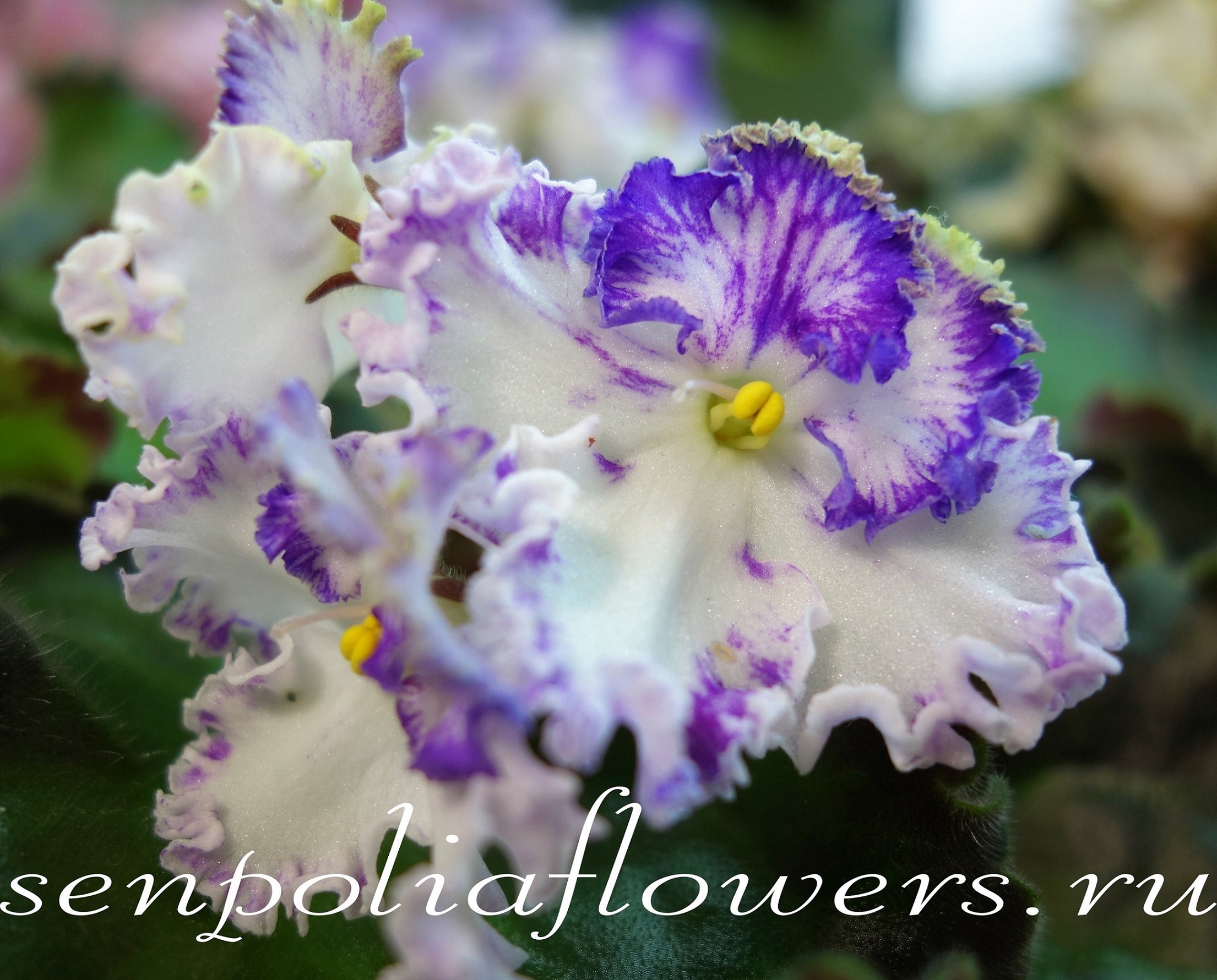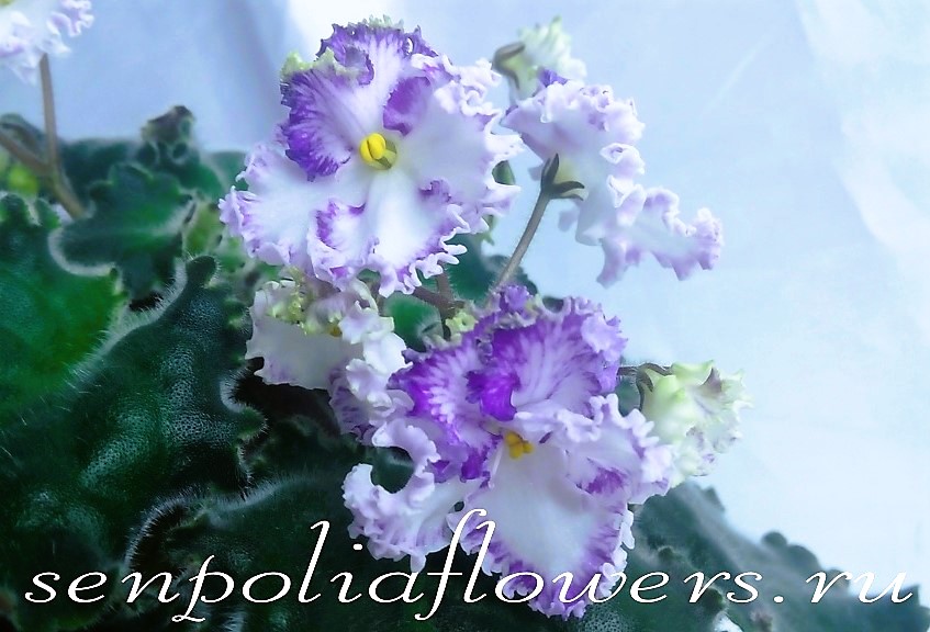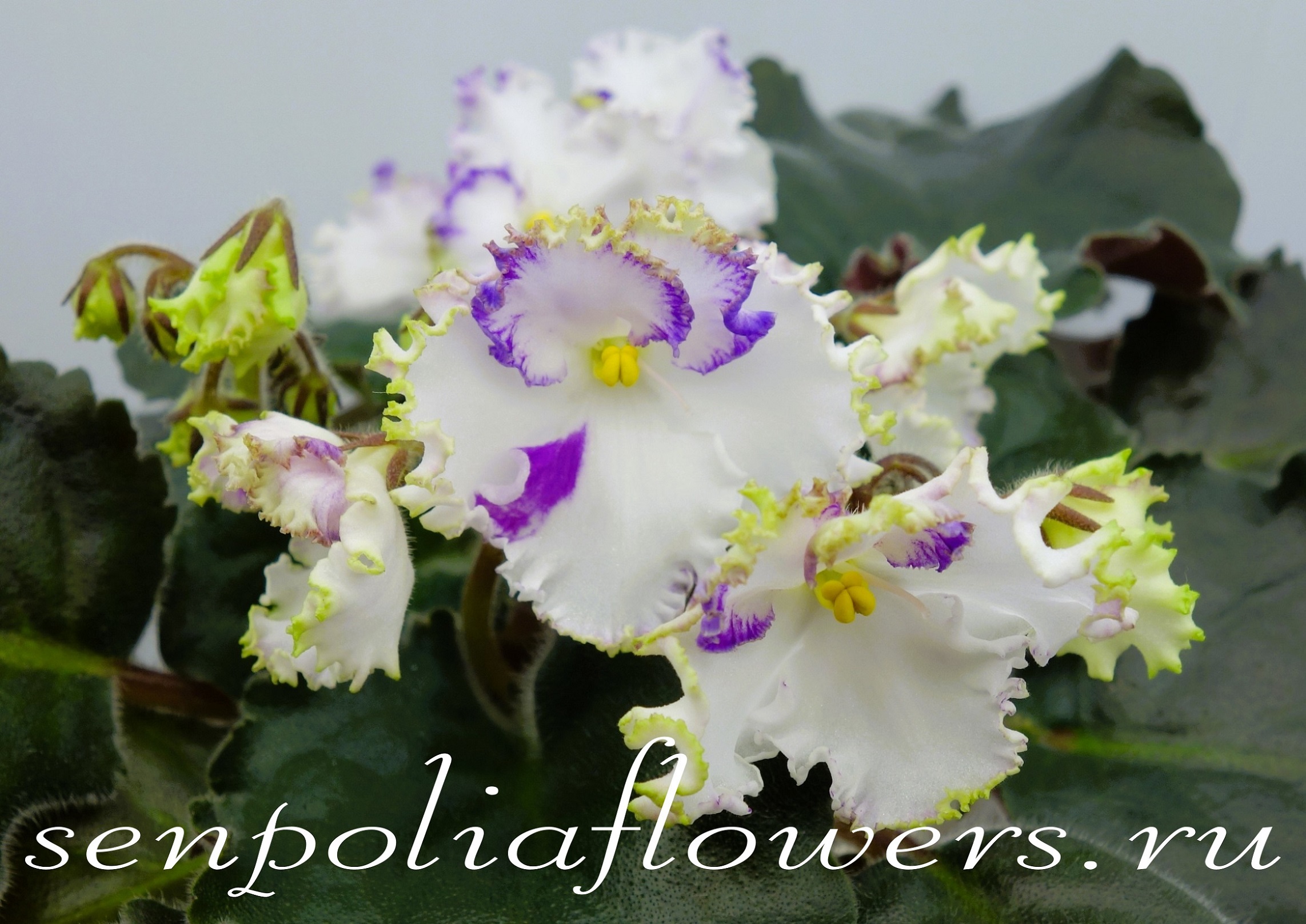 Бело-кремовые, гофрированные "анютки" орхидной формы с тёмно-фиолетовым резным прерывистым узором-сеткой , зелёно-золотистая бахрома на верхних лепестках. Волнистая темно-зеленая блестящая листва. Стандарт.
