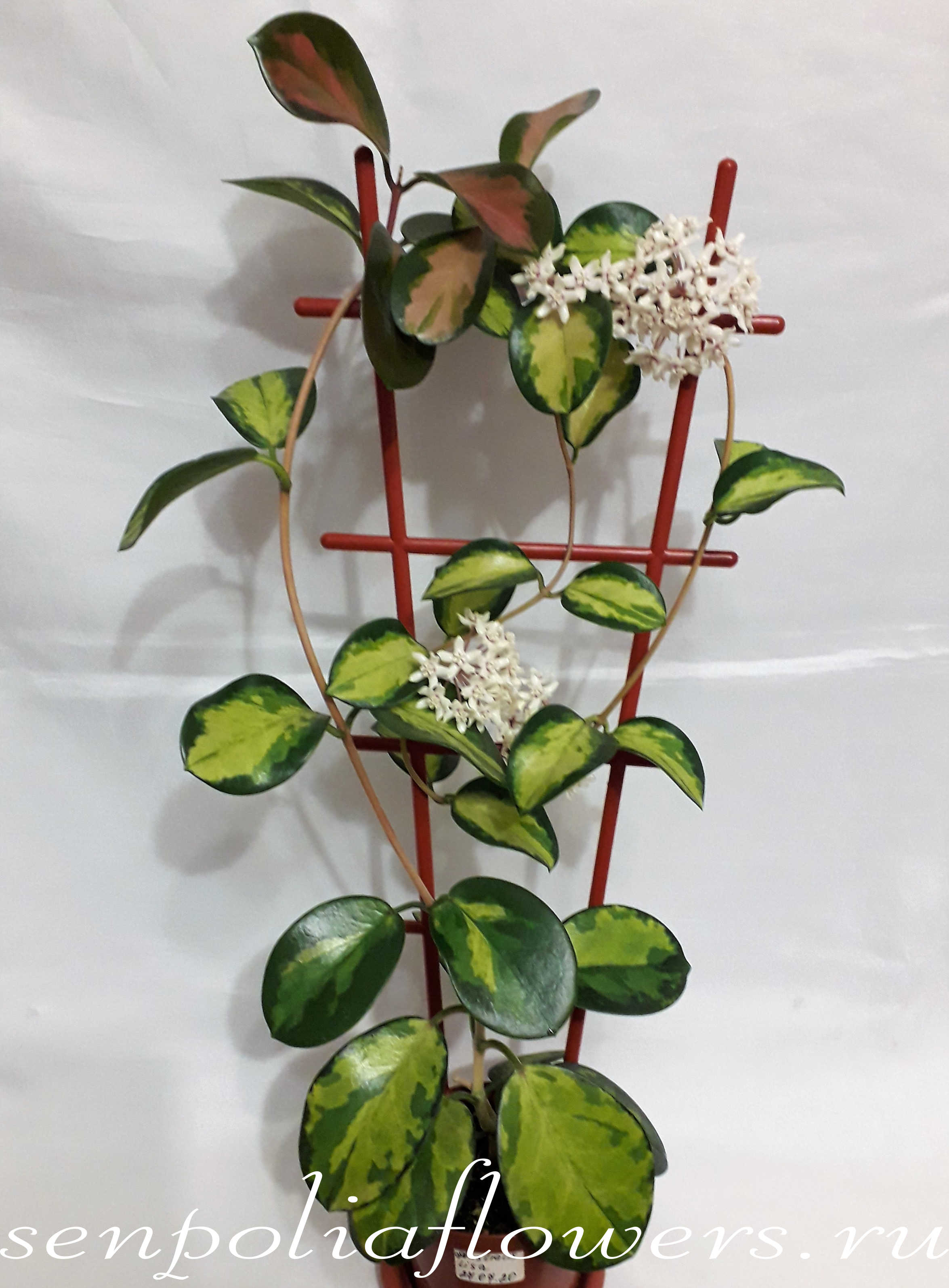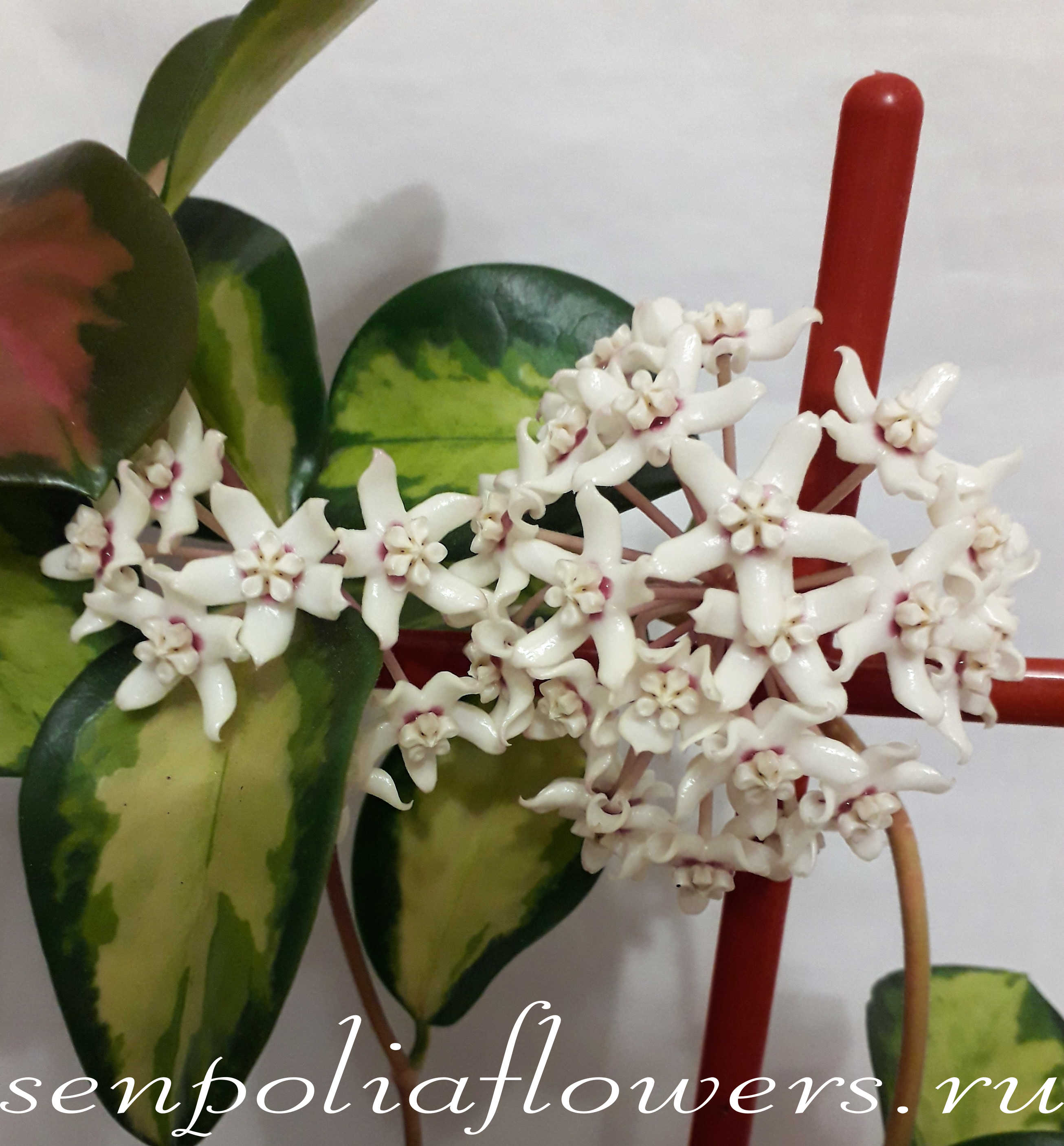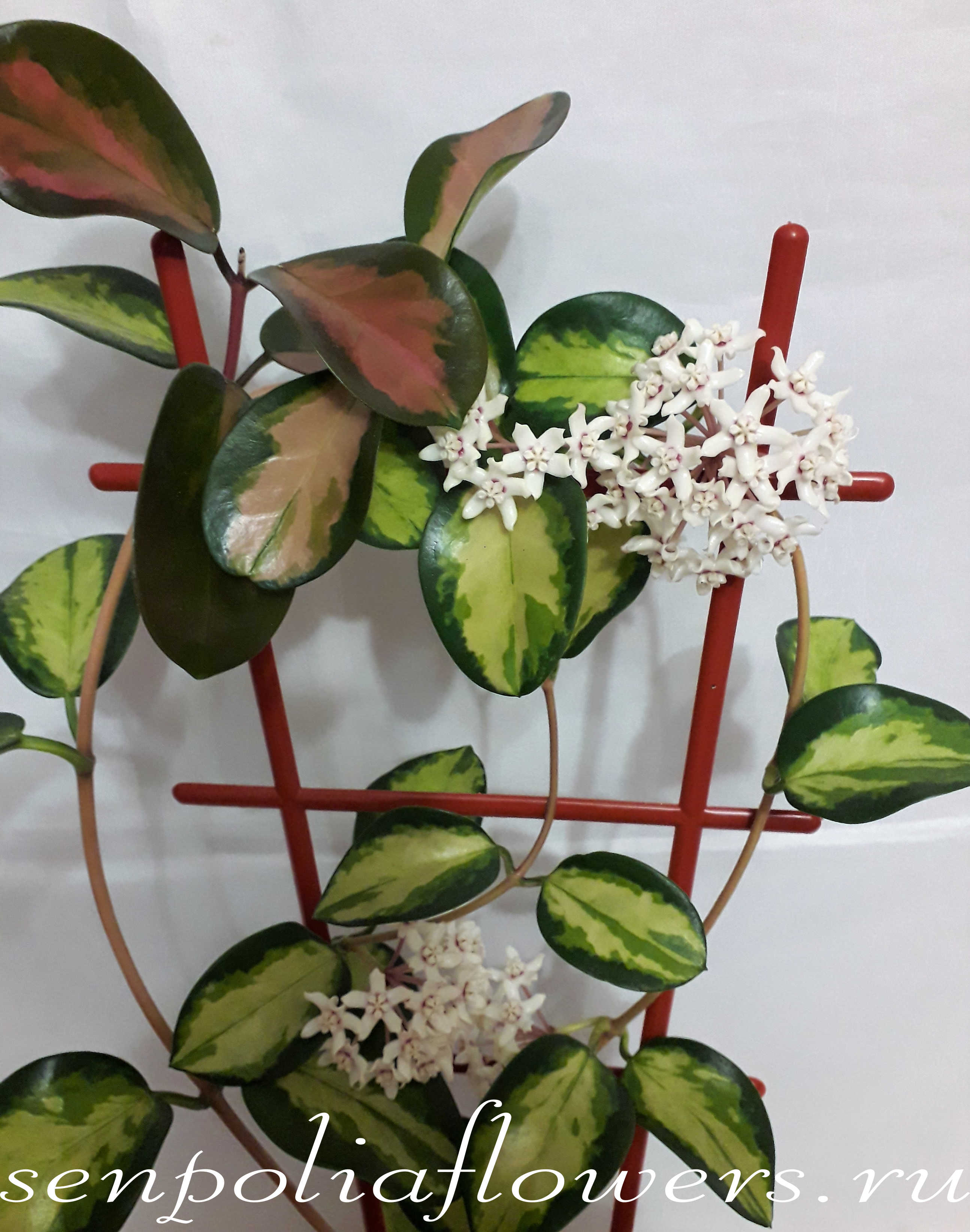 Хойя с овальными листьями , в середине они жёлто-кремово-белые, окантовка – зеленая. Молодые листочки красные, постепенно светлеют с взрослением. У звёздчатых цветов корона белая или бледно-розовая, а середина – красноватая; запах приятный тонкий. Во время цветения выделяют сладковатый нектар.