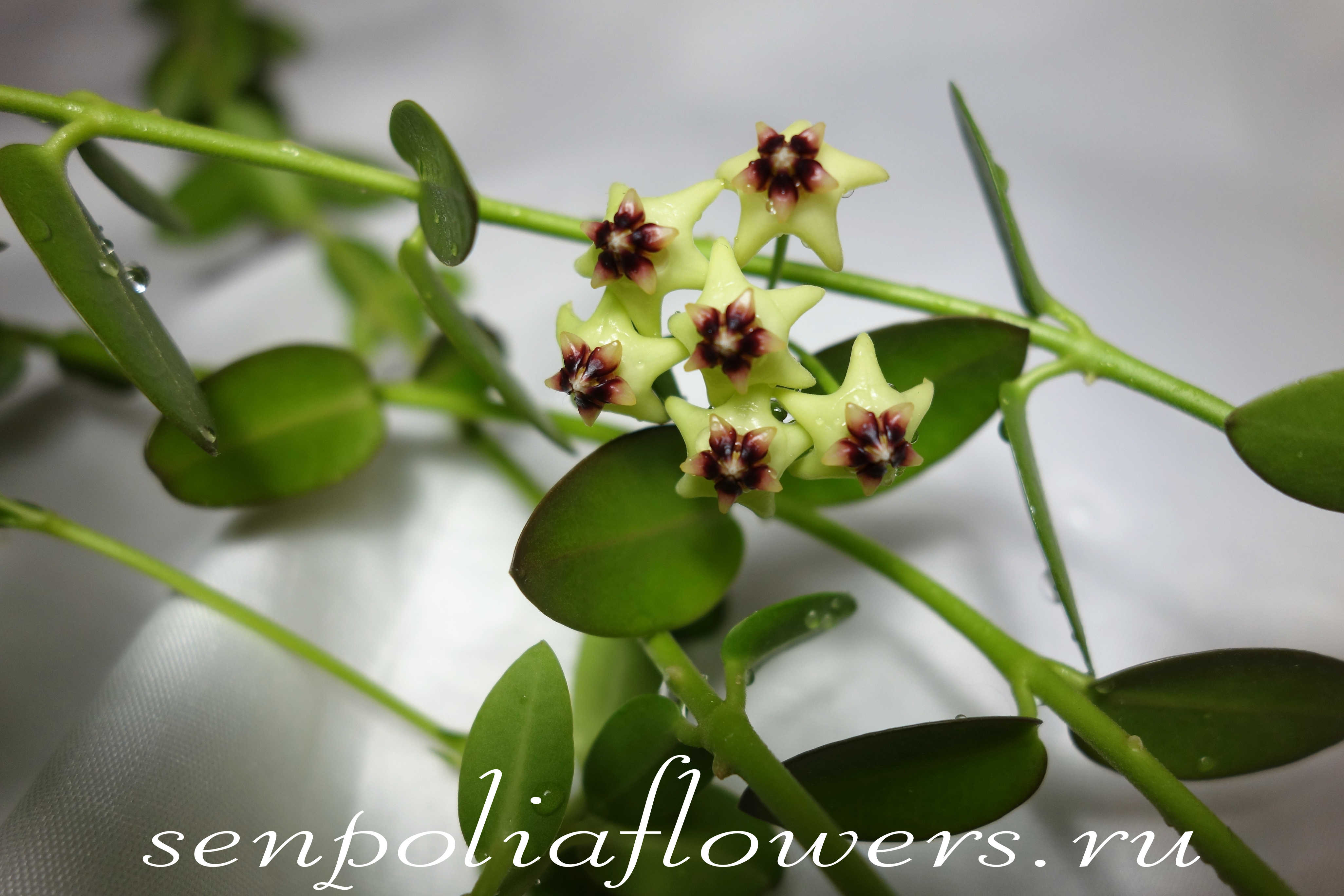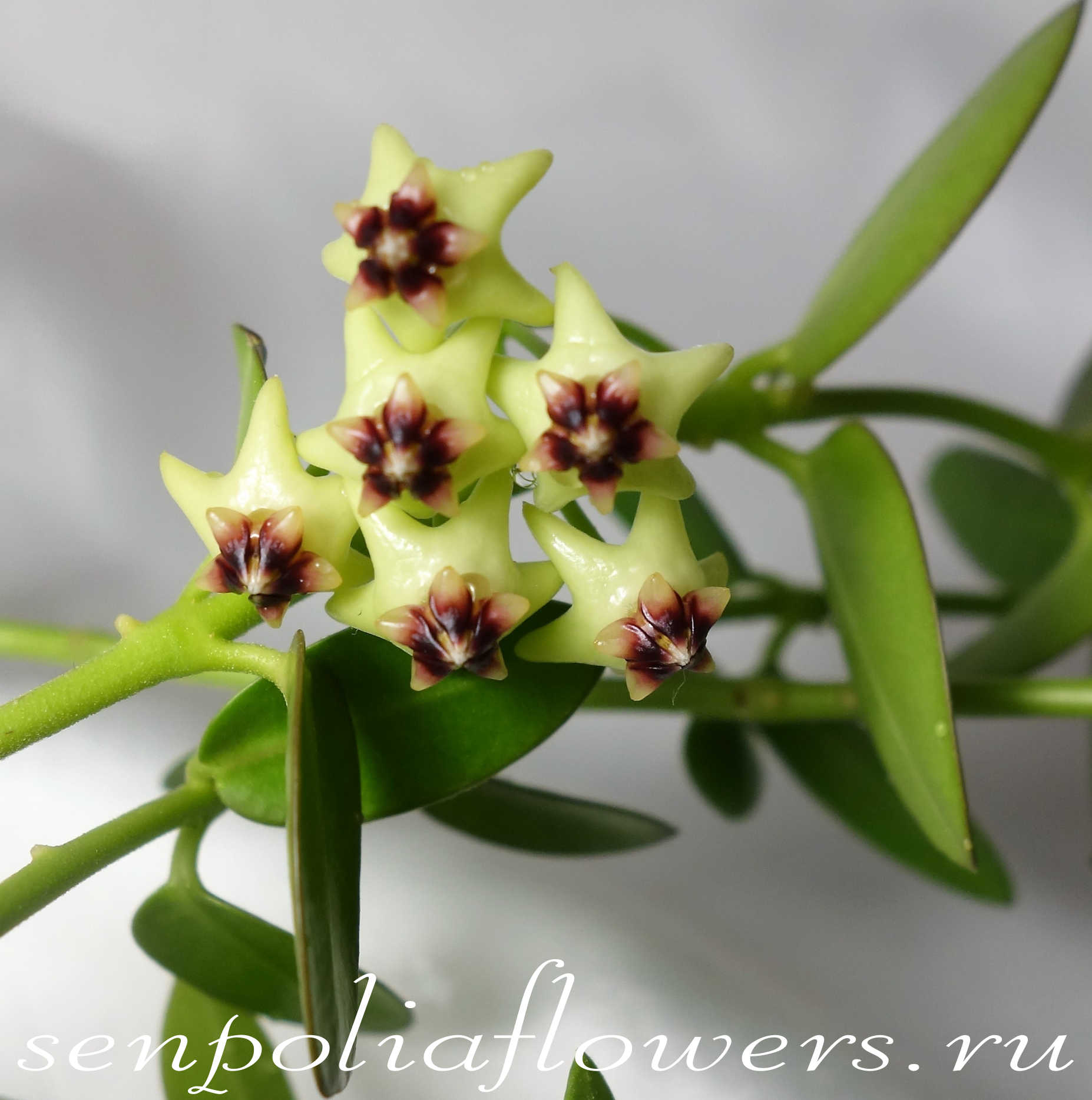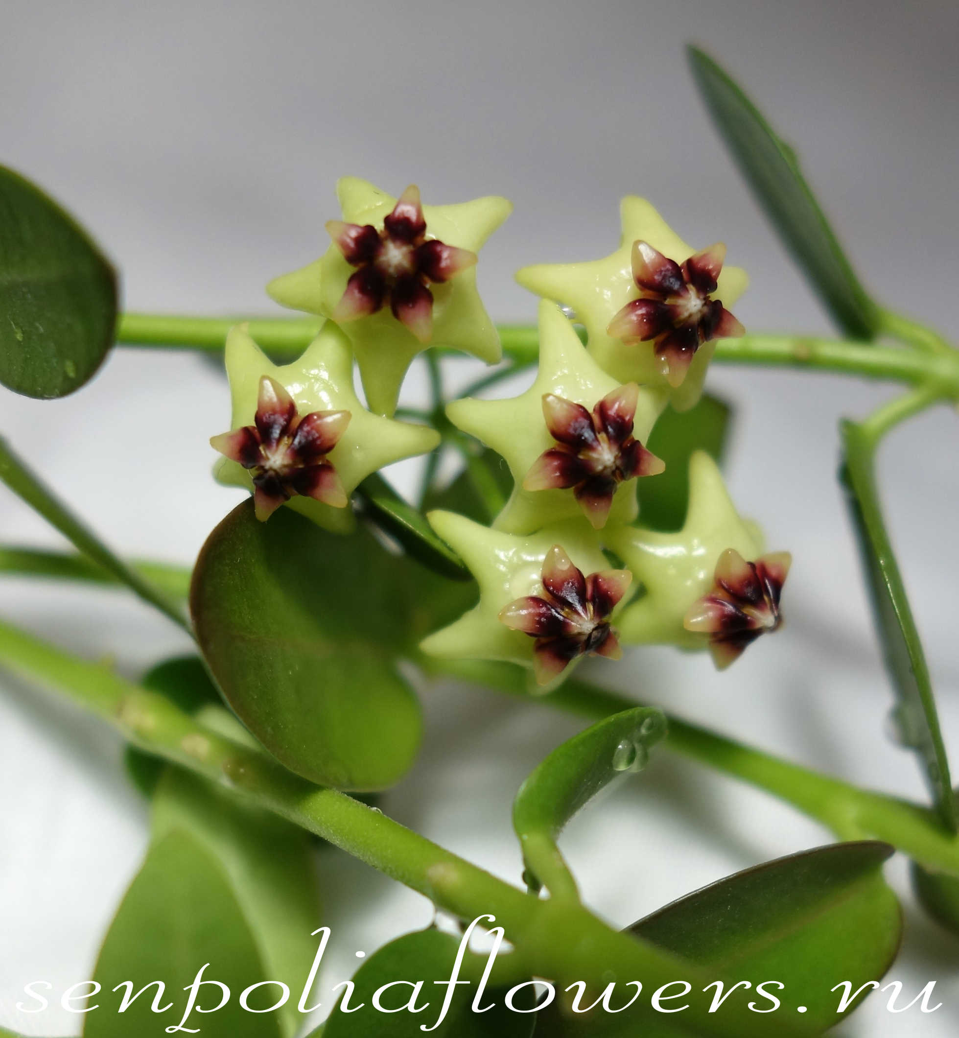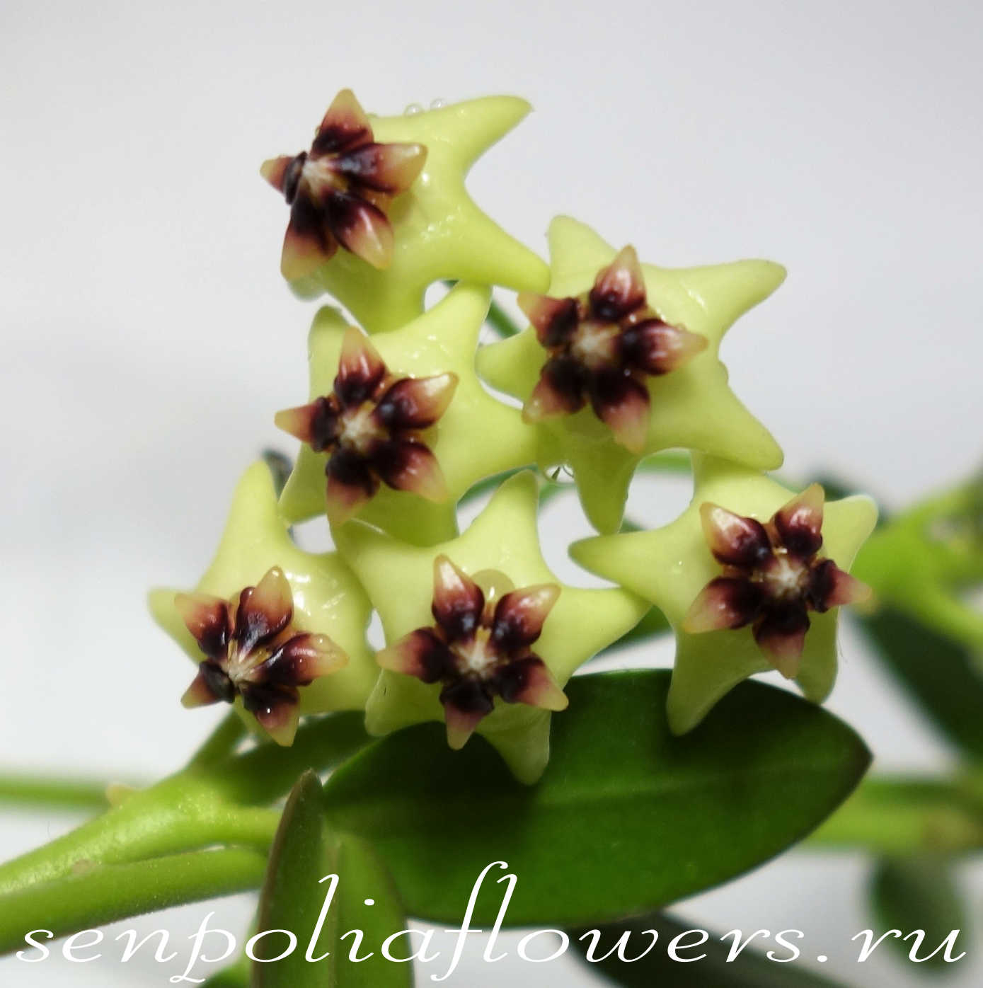Быстрорастущая, легкоукореняющаяся хойя. Листья тонкие овальные длиной до 5 см и шириной до 3 см, средне-зеленые на коротких черенках растут плотно друг к другу( при хорошем освещении). Цветочные зонтики состоят из 15-20 цветов. Лопасти венчика зеленовато-желтые, 0,9 – 1,0 см. диаметром, треугольно-острые, отвернутые, снаружи гладкие, внутри шелковисто-бархатные. Коронка ярко-темно-красная, 0,6 – 0,7 см. в диаметре, приподнята в центре. Для успешного выращивание при посадке растения обязательно добавить известь, требуется много кальция для развития.