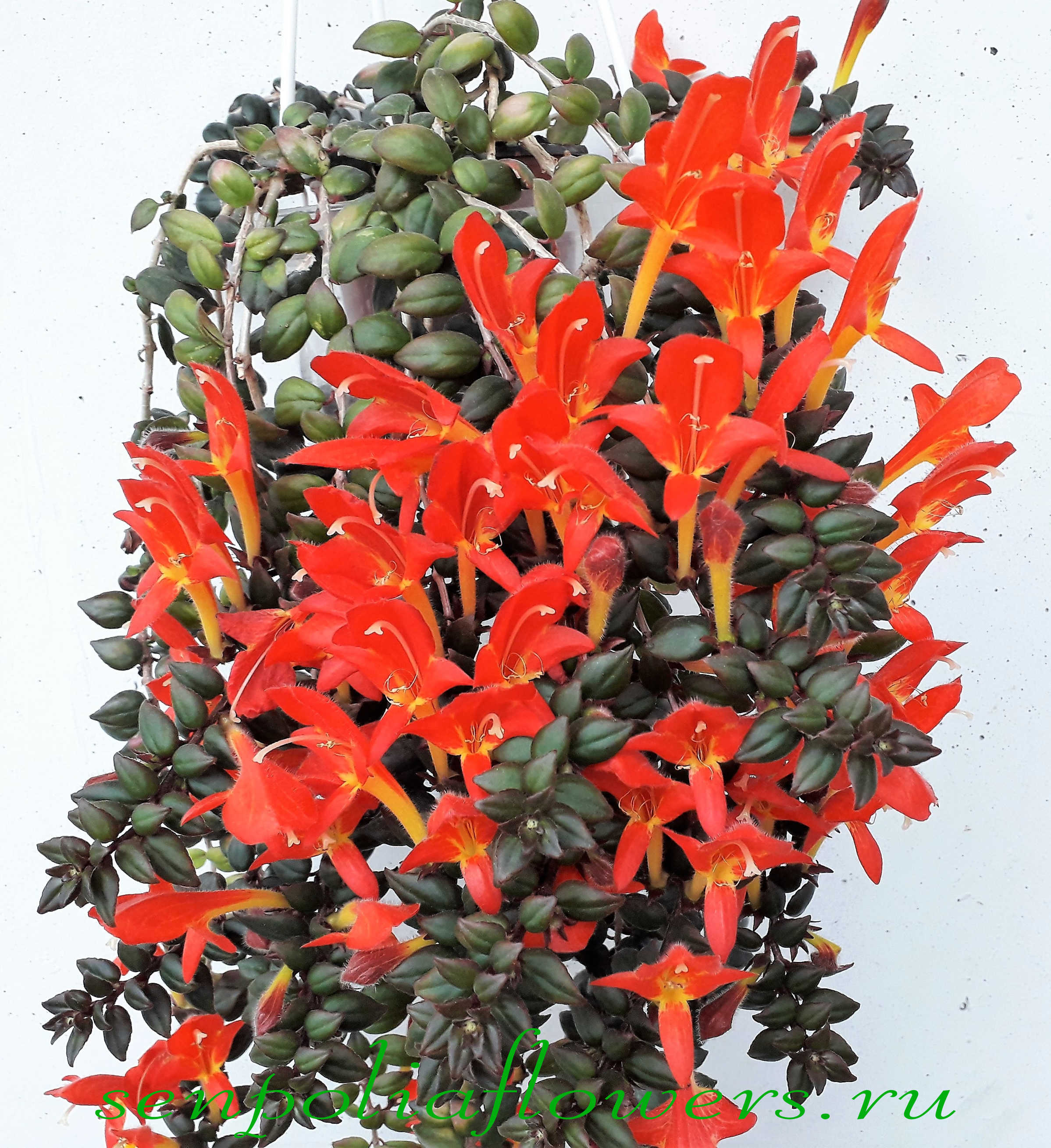 Колумнея Janella- ампельное растение семейства геснериевые. Яркие крупные оранжевые цветы с жёлтой трубочкой и жёлтыми мазками между лепестков создают водопад из прекрасных соцветий. Листва глянцевая заострённая.