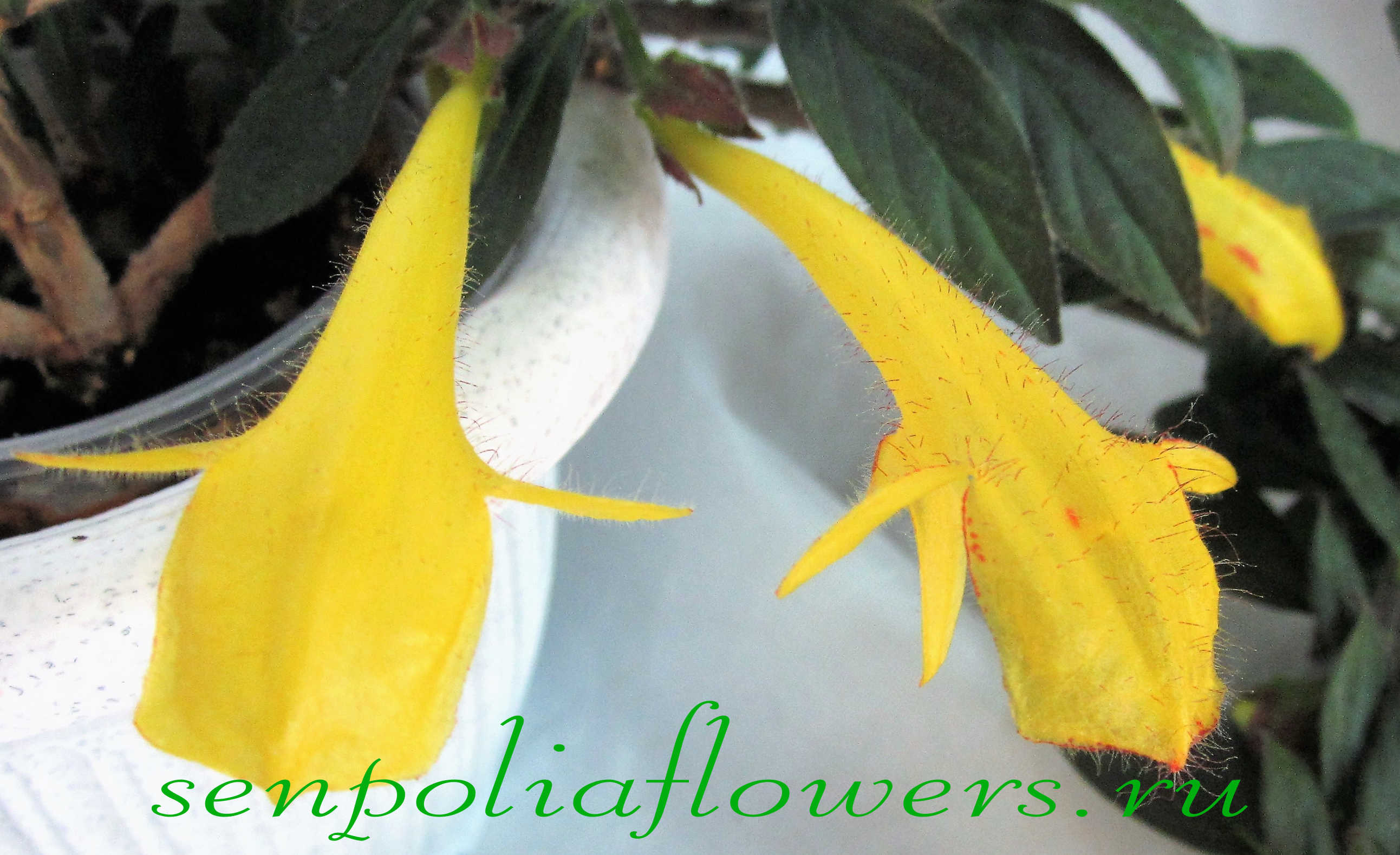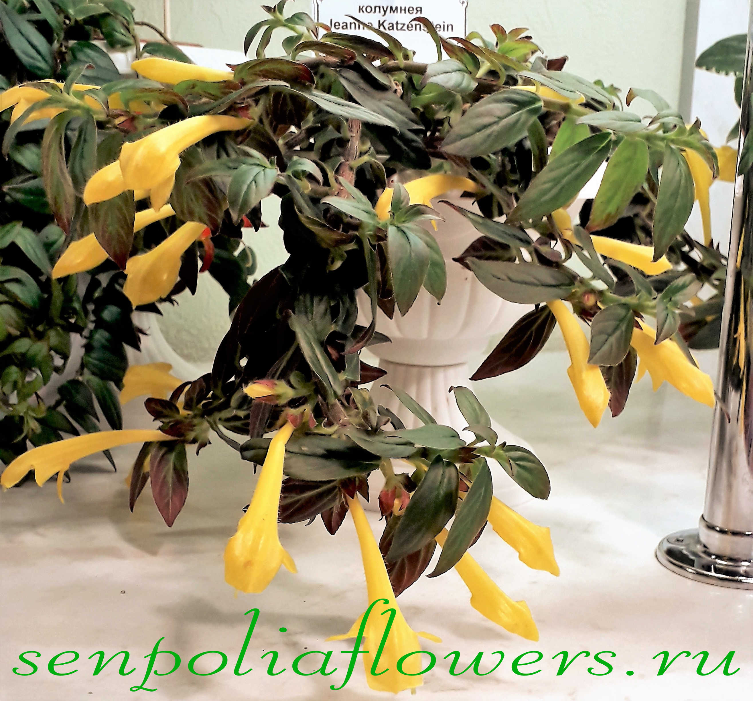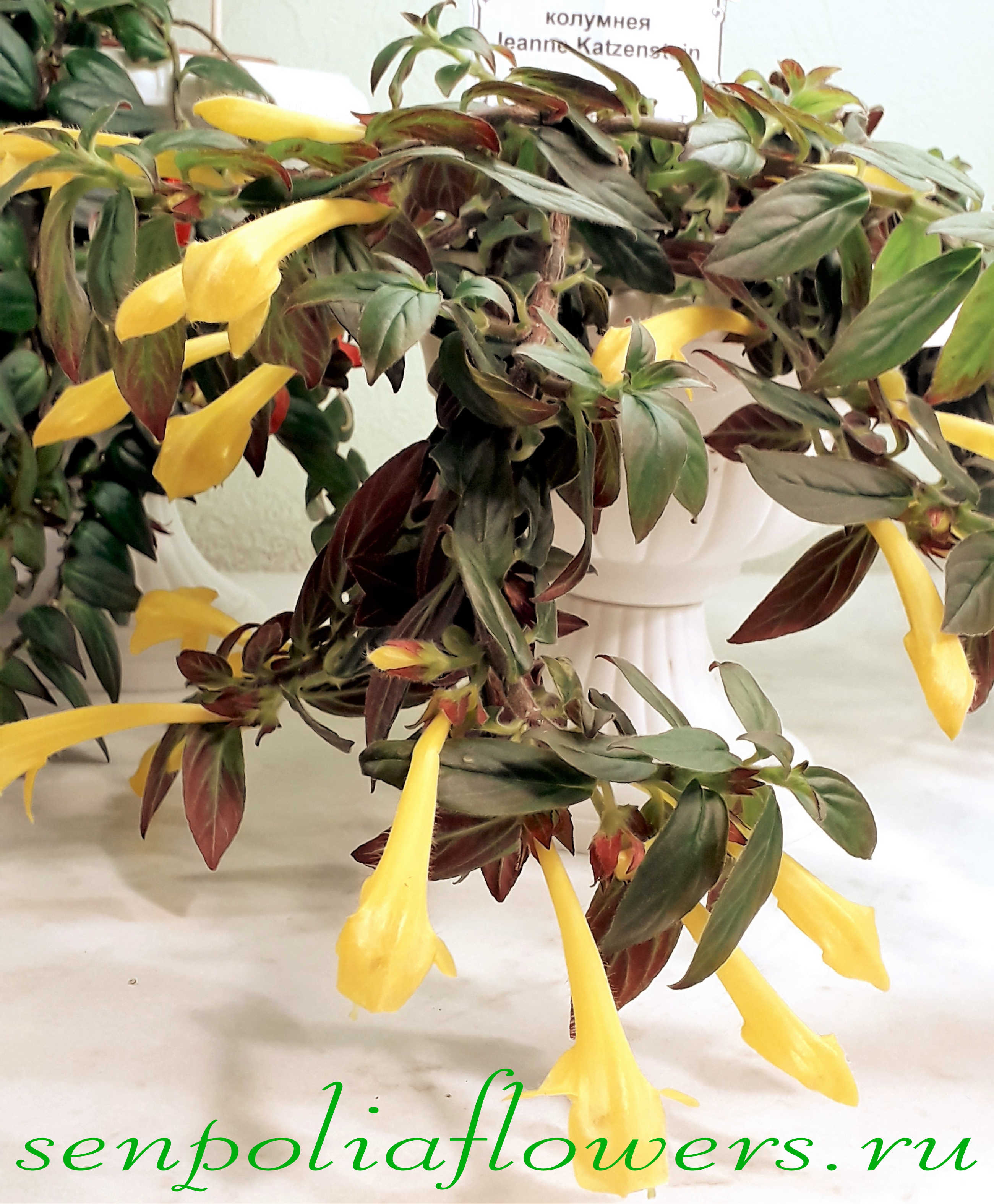 Колумнея Jeanne Katzenstane. Цветки крупные, опушенные, с яркой желтой трубкой, изредка украшенной красными пятнами на спине капюшона. Листья зеленые, иногда с красной изнанкой, некрупные, овальные, заостренные, слабо опушенные. Побеги поникающие, хороший рост, раннее и обильное цветение.