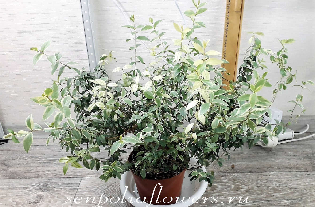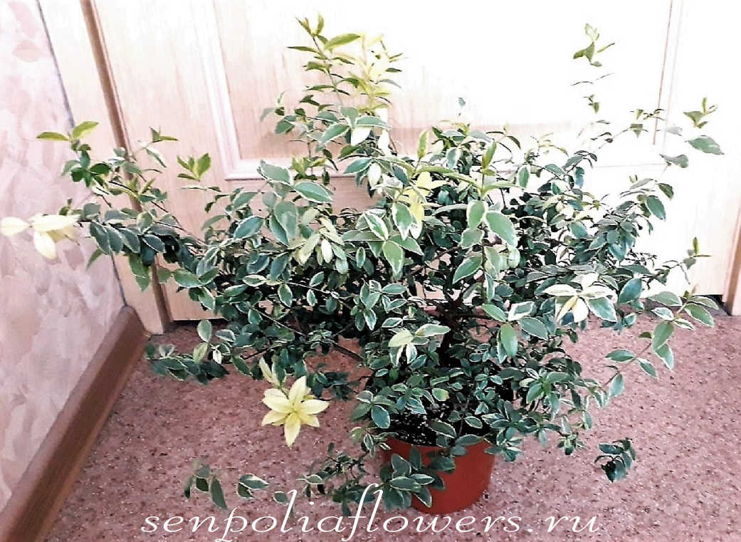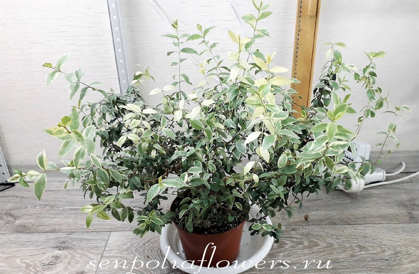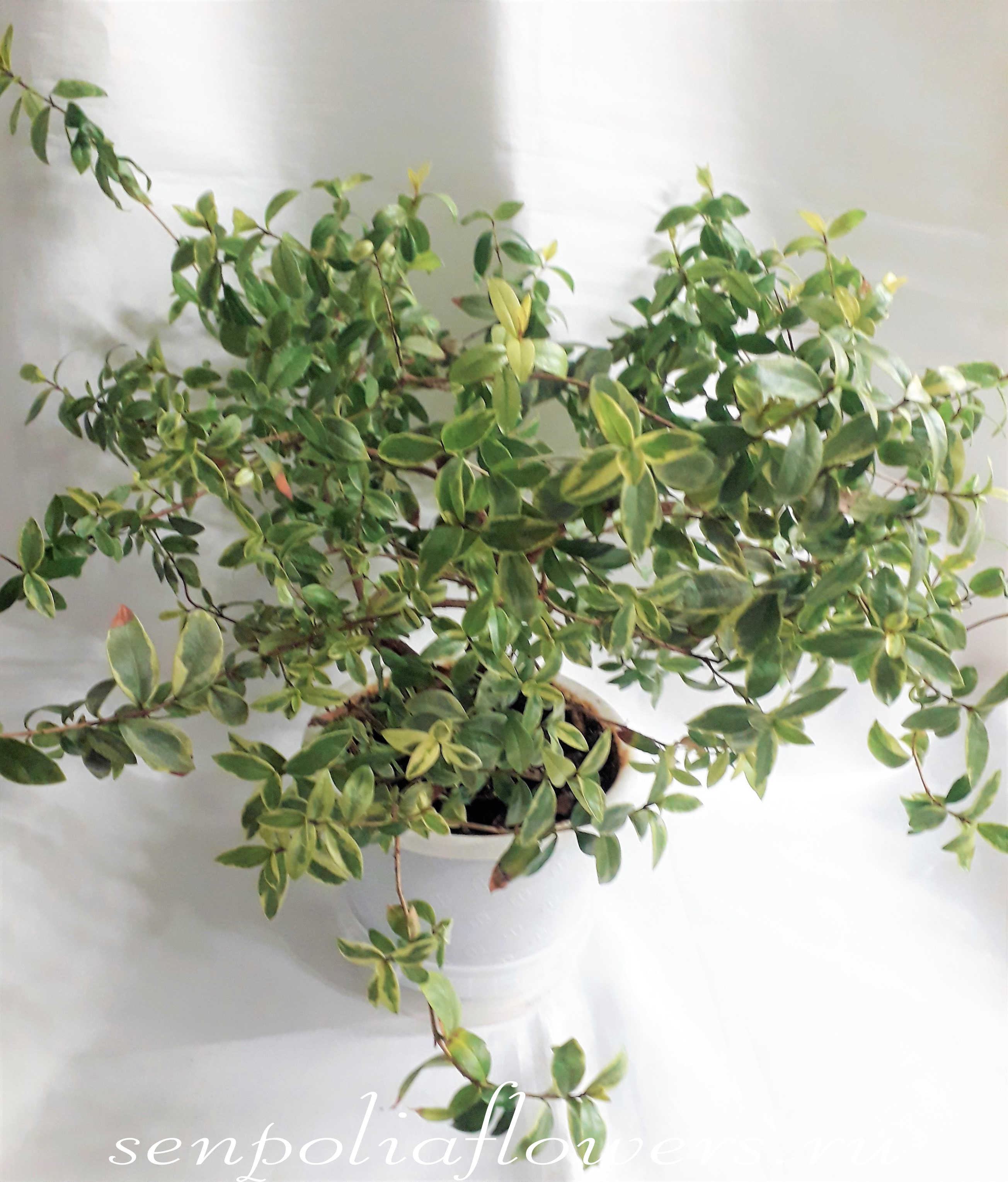 Дерево отличается от других видов оригинальными пестрыми крупными листочками: на них присутствуют кремово-жёлтые или белые спонтанно расположенные мазки. Растение одинаково хорошо чувствует себя как в помещениях, так и под открытым небом. Цветки могут быть белоснежными или светло-бежевыми, тычинки яркие, золотистые. Вариегатный мирт способен нейтрализовать углекислый газ и уничтожать микробов.